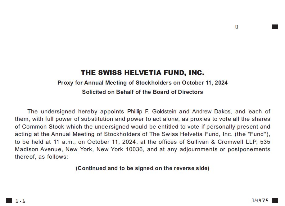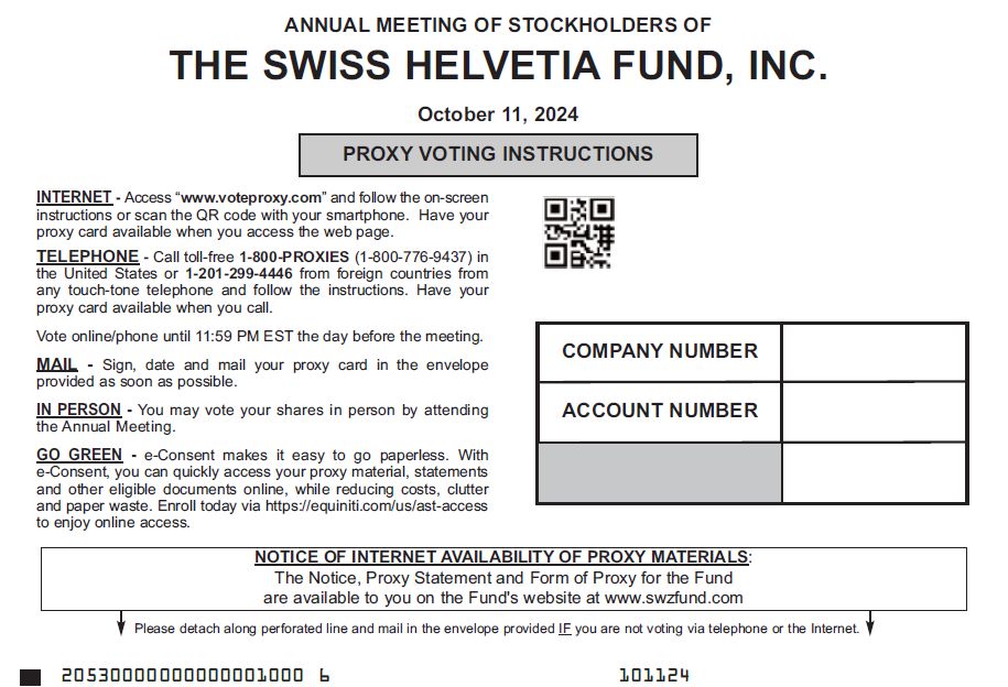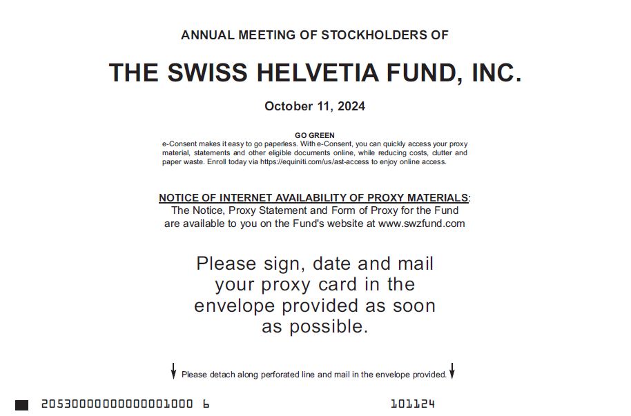 2023 and its most recent Semi-Annual Report to any stockholder upon request. Requests for these Reports should be made in writing to The Swiss Helvetia Fund, Inc., 615 East Michigan Avenue, Milwaukee, Wisconsin 53202, or by calling the Fund's