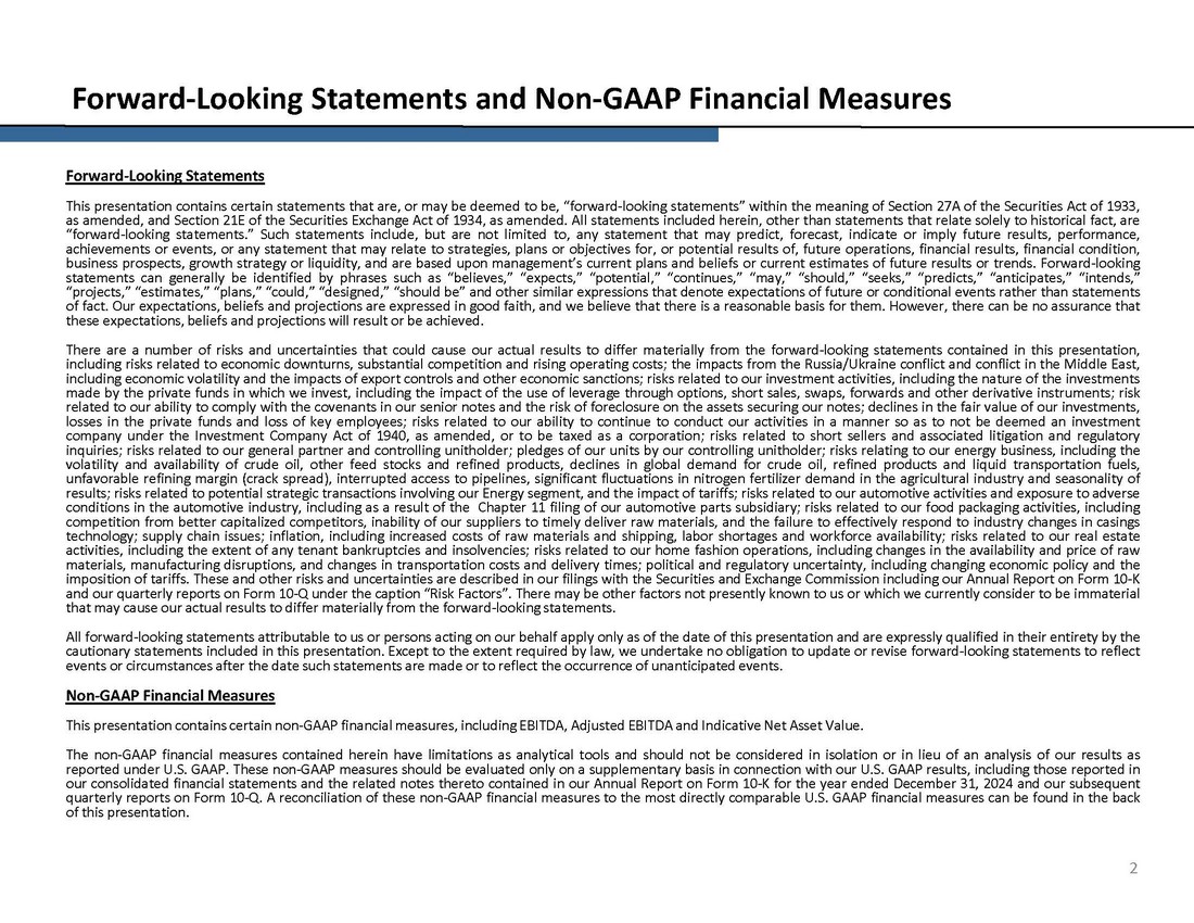 Forward - Looking Statements and Non - GAAP Financial Measures 2 Forward - Looking Statements This presentation contains certain statements that are, or may be deemed to be, “forward - looking statements” within the meaning of Section 27 A of the Securities Act of 1933 , as amended, and Section 21 E of the Securities Exchange Act of 1934 , as amended . All statements included herein, other than statements that relate solely to historical fact, are “forward - looking statements . ” Such statements include, but are not limited to, any statement that may predict, forecast, indicate or imply future results, performance, achievements or events, or any statement that may relate to strategies, plans or objectives for, or potential results of, future operations, financial results, financial condition, business prospects, growth strategy or liquidity, and are based upon management’s current plans and beliefs or current estimates of future results or trends . Forward - looking statements can generally be identified by phrases such as “believes,” “expects,” “potential,” “continues,” “may,” “should,” “seeks,” “predicts,” “anticipates,” “intends,” “projects,” “estimates,” “plans,” “could,” “designed,” “should be” and other similar expressions that denote expectations of future or conditional events rather than statements of fact . Our expectations, beliefs and projections are expressed in good faith, and we believe that there is a reasonable basis for them . However, there can be no assurance that these expectations, beliefs and projections will result or be achieved . There are a number of risks and uncertainties that could cause our actual results to differ materially from the forward - looking statements contained in this presentation, including risks related to economic downturns, substantial competition and rising operating costs ; the impacts from the Russia/Ukraine conflict and conflict in the Middle East, including economic volatility and the impacts of export controls and other economic sanctions ; risks related to our investment activities, including the nature of the investments made by the private funds in which we invest, including the impact of the use of leverage through options, short sales, swaps, forwards and other derivative instruments ; risk related to our ability to comply with the covenants in our senior notes and the risk of foreclosure on the assets securing our notes ; declines in the fair value of our investments, losses in the private funds and loss of key employees ; risks related to our ability to continue to conduct our activities in a manner so as to not be deemed an investment company under the Investment Company Act of 1940 , as amended, or to be taxed as a corporation ; risks related to short sellers and associated litigation and regulatory inquiries ; risks related to our general partner and controlling unitholder ; pledges of our units by our controlling unitholder ; risks relating to our energy business, including the volatility and availability of crude oil, other feed stocks and refined products, declines in global demand for crude oil, refined products and liquid transportation fuels, unfavorable refining margin (crack spread), interrupted access to pipelines, significant fluctuations in nitrogen fertilizer demand in the agricultural industry and seasonality of results ; risks related to potential strategic transactions involving our Energy segment, and the impact of tariffs ; risks related to our automotive activities and exposure to adverse conditions in the automotive industry, including as a result of the Chapter 11 filing of our automotive parts subsidiary ; risks related to our food packaging activities, including competition from better capitalized competitors, inability of our suppliers to timely deliver raw materials, and the failure to effectively respond to industry changes in casings technology ; supply chain issues ; inflation, including increased costs of raw materials and shipping, labor shortages and workforce availability ; risks related to our real estate activities, including the extent of any tenant bankruptcies and insolvencies ; risks related to our home fashion operations, including changes in the availability and price of raw materials, manufacturing disruptions, and changes in transportation costs and delivery times ; political and regulatory uncertainty, including changing economic policy and the imposition of tariffs . These and other risks and uncertainties are described in our filings with the Securities and Exchange Commission including our Annual Report on Form 10 - K and our quarterly reports on Form 10 - Q under the caption “Risk Factors” . There may be other factors not presently known to us or which we currently consider to be immaterial that may cause our actual results to differ materially from the forward - looking statements . All forward - looking statements attributable to us or persons acting on our behalf apply only as of the date of this presentation and are expressly qualified in their entirety by the cautionary statements included in this presentation . Except to the extent required by law, we undertake no obligation to update or revise forward - looking statements to reflect events or circumstances after the date such statements are made or to reflect the occurrence of unanticipated events . Non - GAAP Financial Measures This presentation contains certain non - GAAP financial measures, including EBITDA, Adjusted EBITDA and Indicative Net Asset Value. The non - GAAP financial measures contained herein have limitations as analytical tools and should not be considered in isolation or in lieu of an analysis of our results as reported under U . S . GAAP . These non - GAAP measures should be evaluated only on a supplementary basis in connection with our U . S . GAAP results, including those reported in our consolidated financial statements and