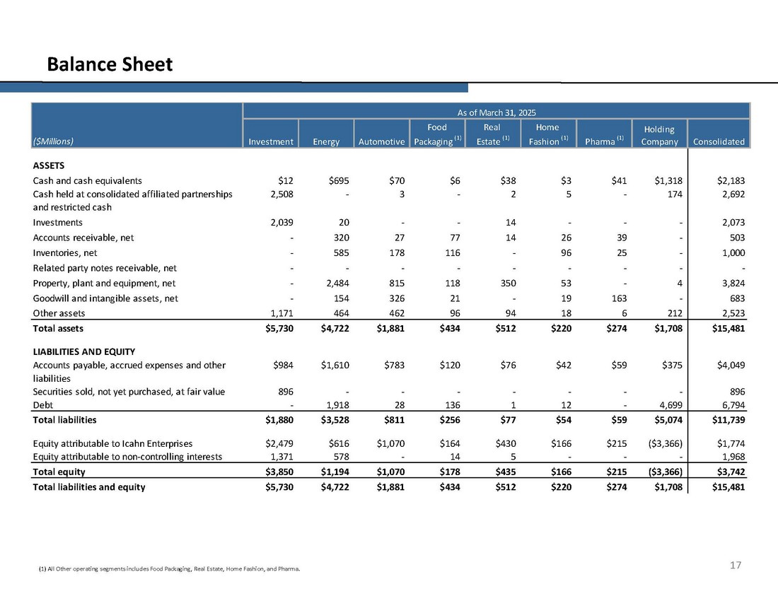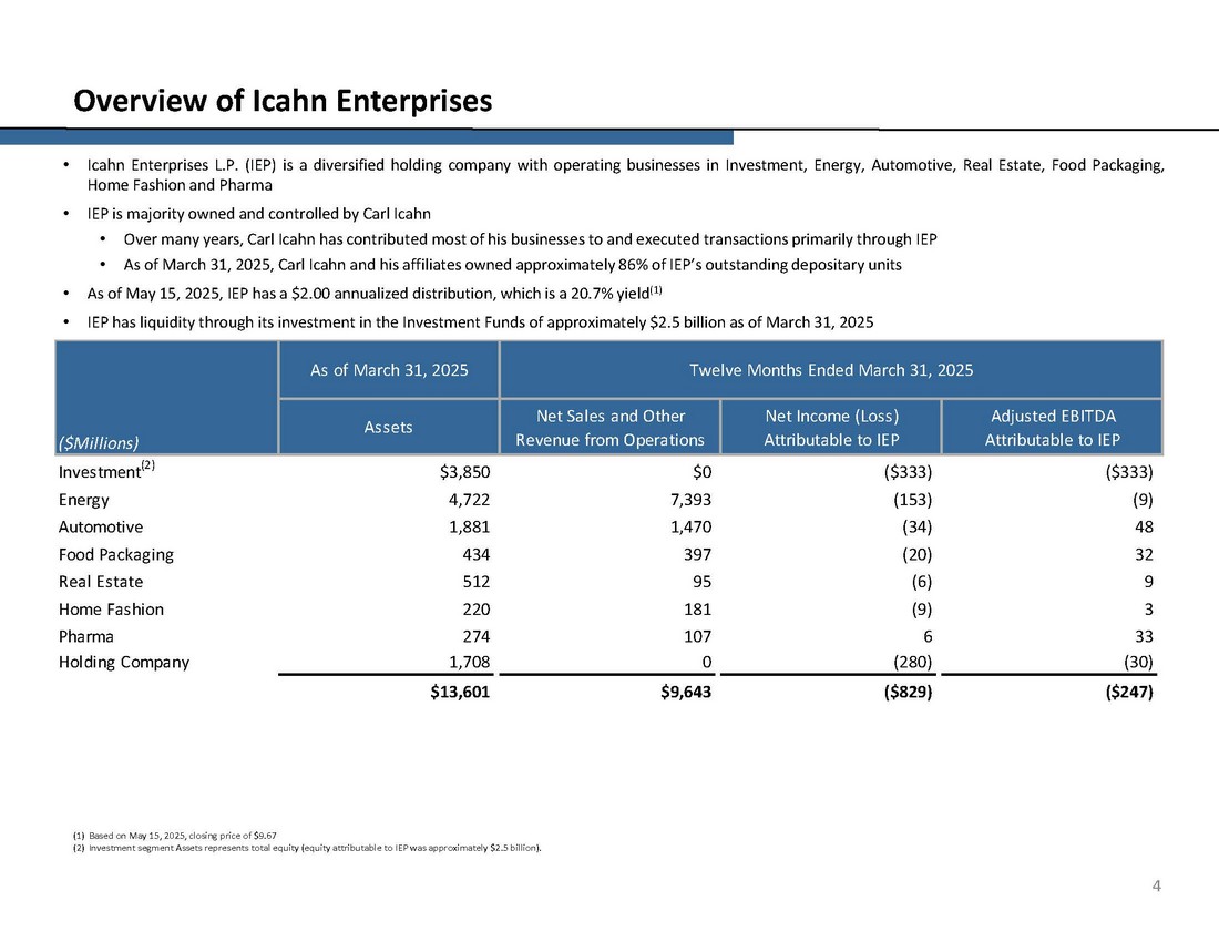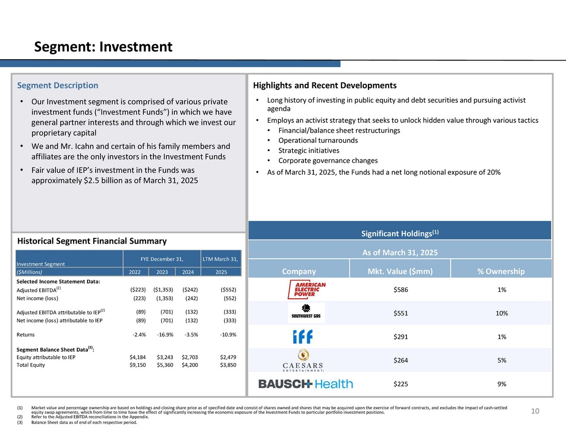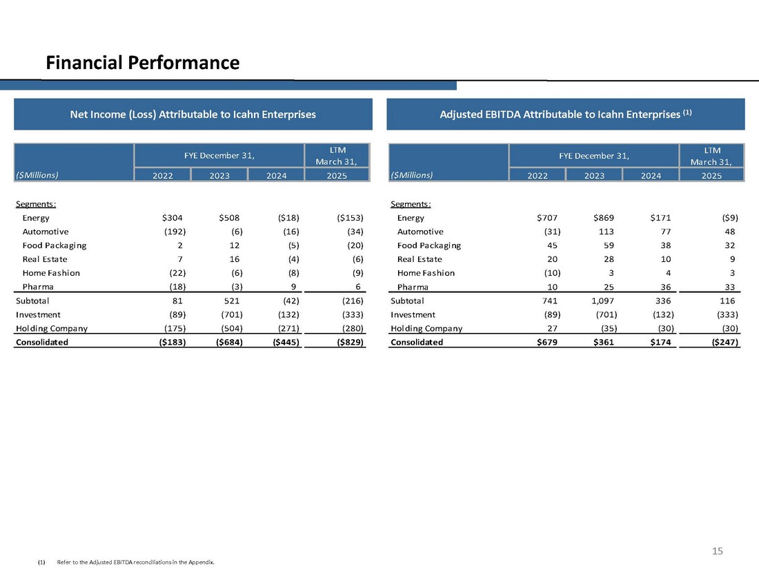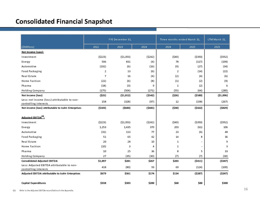 Consolidated Financial Snapshot LTM March 31, March 31, ended Three months FYE December 31, ($Millions) 2025 2025 2024 2024 2023 2022 Net Income (Loss): ($552) ($350) ($40) ($242) ($1,353) ($223) Investment (199) (117) 78 (4) 831 596 Energy (34) (27) (9) (16) (6) (192) Automotive (22) (14) 2 (6) 13 2 Food Packaging (6) (4) (2) (4) 16 7 Real Estate (9) (2) (1) (8) (6) (22) Home Fashion 6 (2) 1 9 (3) (18) Pharma (280) (64) (55) (271) (504) (175) Holding Company ($1,096) ($580) ($26) ($542) ($1,012) ($25) Net income (loss) (267) (158) 12 (97) (328) 158 Less: net income (loss) attributable to non - controlling interests ($829) ($422) ($38) ($445) ($684) ($183) Net income (loss) attributable to Icahn Enterprises Adjusted EBITDA (1) : ($552) ($350) ($40) ($242) ($1,353) ($223) Investment 106 (61) 203 370 1,435 1,253 Energy 48 (6) 23 77 113 (31) Automotive 36 8 14 42 65 51 Food Packaging 9 - 1 10 28 20 Real Estate 3 - 1 4 3 (10) Home Fashion 33 5 8 36 25 10 Pharma (30) (7) (7) (30) (35) 27 Holding Company ($347) ($411) $203 $267 $281 $1,097 Consolidated Adjusted EBITDA (100) (124) 69 93 (80) 418 Less: Adjusted EBITDA attributable to non - controlling interests ($247) ($287) $134 $174 $361 $679 Adjusted EBITDA attributable to Icahn Enterprises $300 $88 $68 $280 $303 $338 Capital Expenditures 16 (1) Refer to the Adjusted EBITDA reconciliations in the Appendix.