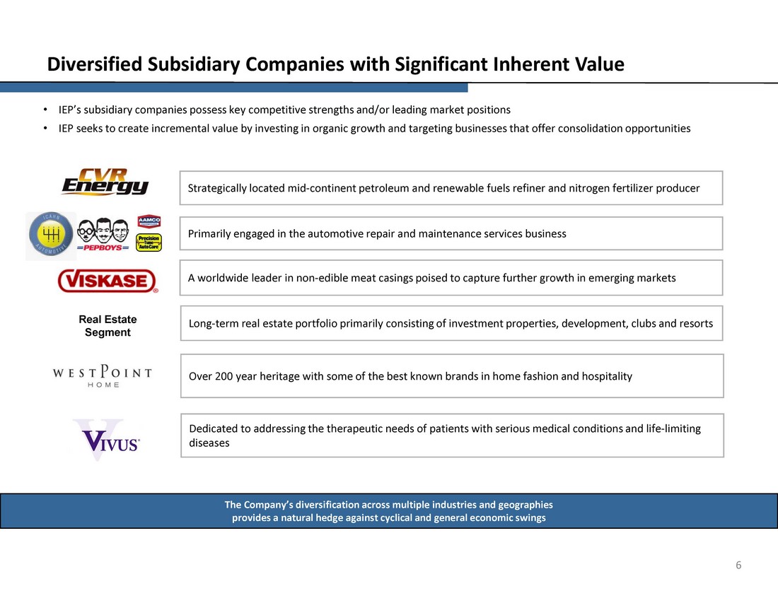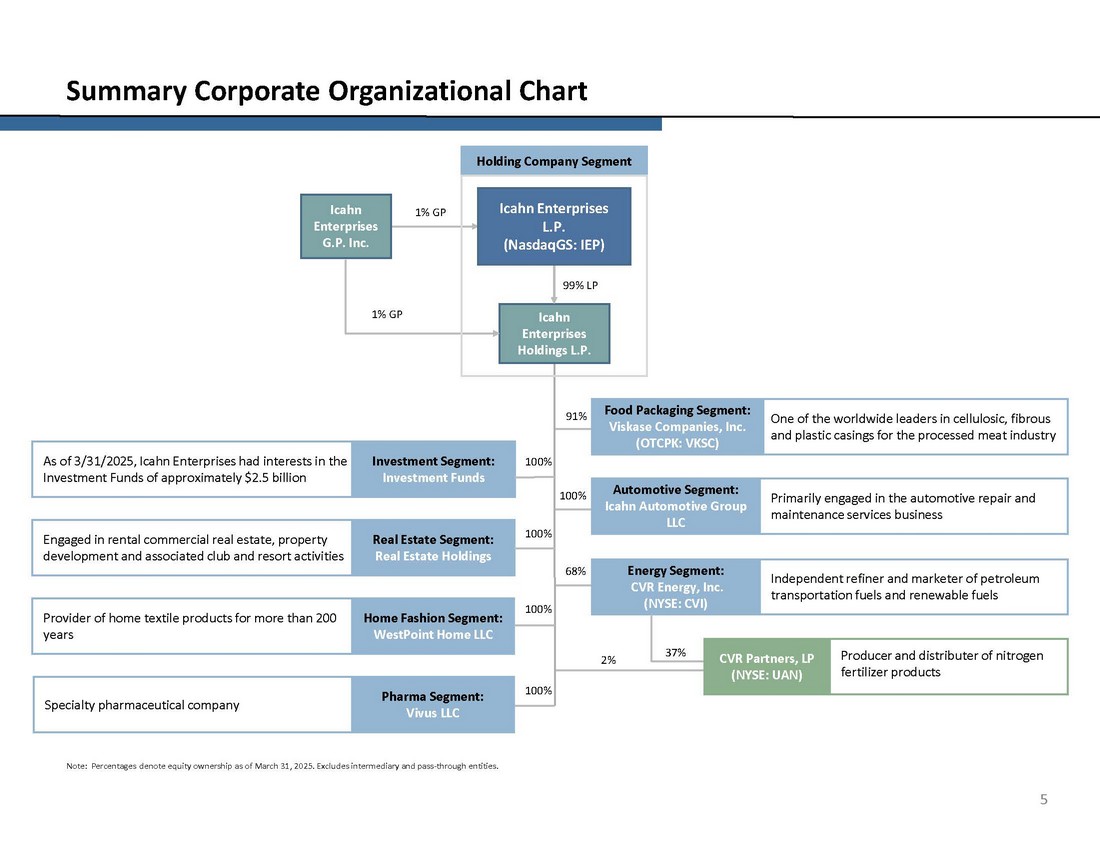 Summary Corporate Organizational Chart Note: Percentages denote equity ownership as of March 31, 2025. Excludes intermediary and pass - through entities. 99% LP Energy Segment: CVR Energy, Inc. (NYSE: CVI) Pharma Segment: Vivus LLC Real Estate Segment: Real Estate Holdings Home Fashion Segment: WestPoint Home LLC Icahn Enterprises G.P. Inc. Icahn Enterprises L.P. (NasdaqGS: IEP) Icahn Enterprises Holdings L.P. 1% GP 1% GP 91% 68% Investment Segment: Investment Funds Food Packaging Segment: Viskase Companies, Inc. (OTCPK: VKSC) As of 3/31/2025, Icahn Enterprises had interests in the Investment Funds of approximately $2.5 billion Engaged in rental commercial real estate, property development and associated club and resort activities Provider of home textile products for more than 200 years Specialty pharmaceutical company One of the worldwide leaders in cellulosic, fibrous and plastic casings for the processed meat industry Independent refiner and marketer of petroleum transportation fuels and renewable fuels 100% 100% 100% 100% Automotive Segment: Icahn Automotive Group LLC Primarily engaged in the automotive repair and maintenance services business 100% Producer and distributer of nitrogen fertilizer products CVR Partners, LP (NYSE: UAN) 37% Holding Company Segment 2% 5