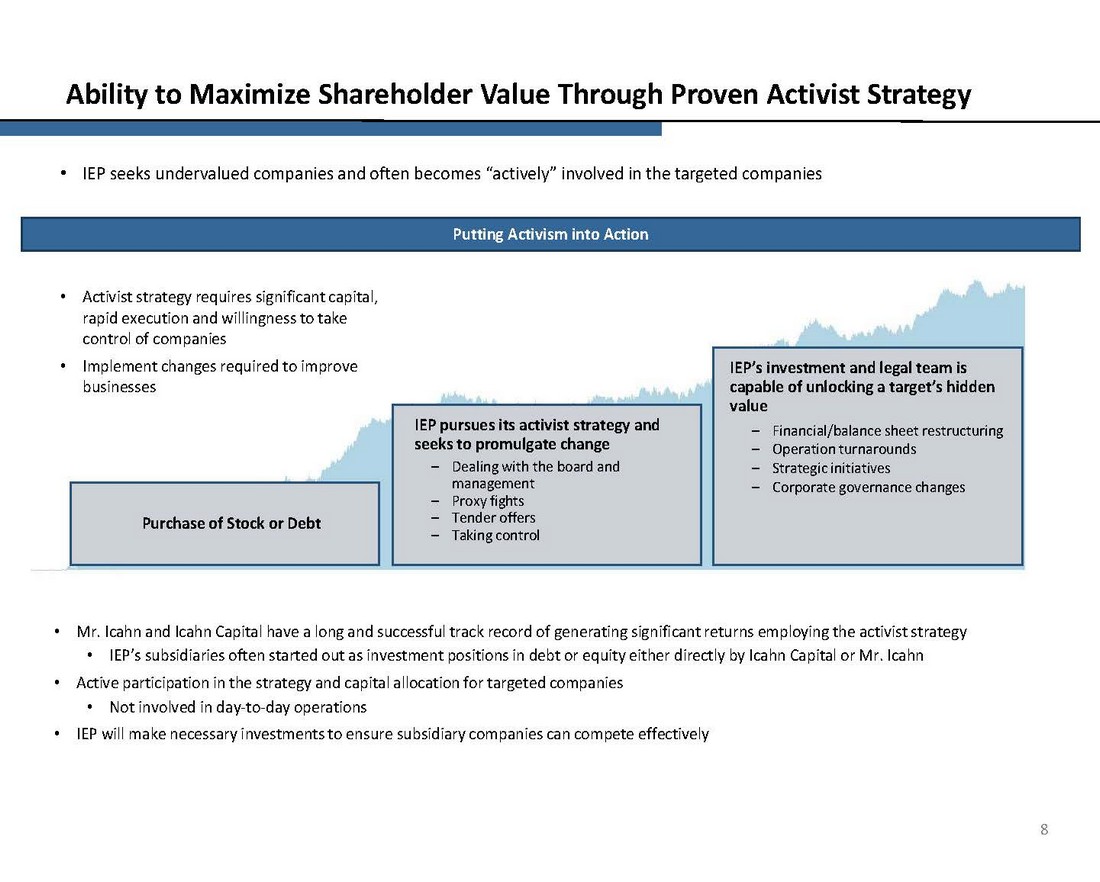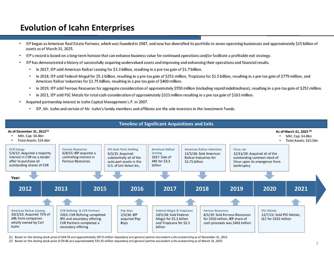 Evolution of Icahn Enterprises • IEP began as American Real Estate Partners, which was founded in 1987, and now has diversified its portfolio to seven operating businesses and approximately $15 billion of assets as of March 31, 2025. • IEP’s record is based on a long - term horizon that can enhance business value for continued operations and/or facilitate a profitable exit strategy. • IEP has demonstrated a history of successfully acquiring undervalued assets and improving and enhancing their operations and financial results. • In 2017, IEP sold American Railcar Leasing for $3.3 billion, resulting in a pre - tax gain of $1.7 billion. • In 2018, IEP sold Federal - Mogul for $5.1 billion, resulting in a pre - tax gain of $251 million, Tropicana for $1.5 billion, resulting in a pre - tax gain of $779 million, and American Railcar Industries for $1.75 billion, resulting in a pre - tax gain of $400 million. • In 2019, IEP sold Ferrous Resources for aggregate consideration of approximately $550 million (including repaid indebtedness), resulting in a pre - tax gain of $252 million. • In 2021, IEP sold PSC Metals for total cash consideration of approximately $323 million resulting in a pre - tax gain of $163 million. • Acquired partnership interest in Icahn Capital Management L.P. in 2007. • IEP, Mr. Icahn and certain of Mr. Icahn’s family members and affiliates are the sole investors in the Investment Funds. Timeline of Significant Acquisitions and Exits (1) Based on the closing stock price of $44.70 and approximately 107.0 million depositary and general partner equivalent units outstanding as of December 31, 2012 (2) Based on the closing stock price of $9.06 and approximately 533.35 million depositary and general partner equivalent units outstanding as of March 31, 2025 • Mkt. Cap: $4.8bn • Total Assets: $24.6bn As of December 31, 2012 (1) As of March 31, 2025 (2) • Mkt. Cap: $4.8bn • Total Assets: $15.5bn Year: 2021 2020 2019 2018 2017 2016 2015 2013 2012 American Railcar Leasing 10/2/13: Acquired 75% of ARL from companies wholly owned by Carl Icahn Ferrous Resources 6/8/15: IEP acquired a controlling interest in Ferrous Resources Pep Boys 2/4/16: IEP acquired Pep Boys Federal - Mogul & Tropicana 10/1/18: Sold Federal - Mogul for $5.1 billion and Tropicana for $1.5 billion Ferrous Resources 8/1/19: Sold Ferrous Resources for $550 million, IEP share of cash proceeds was $463 million PSC Metals 12/7/21: Sold PSC Metals, LLC for $323 million CVR Energy 5/4/12: Acquired a majority interest in CVR via a tender offer to purchase all outstanding shares of CVR CVR Refining & CVR Partners 2013: CVR Refining completed IPO and secondary offering. CVR Partners completed a secondary offering IEH Auto Parts Holding 6/1/15: Acquired substantially all of the auto part assets in the U.S. of Uni - Select Inc. American Railcar Leasing 2017 : Sale of ARL for $ 3 . 3 billion 7 American Railcar Industries 12/5/18: Sold American Railcar Industries for $1.75 billion Vivus, Inc 12/11/20: Acquired all of the outstanding common stock of Vivus upon its emergence from bankruptcy