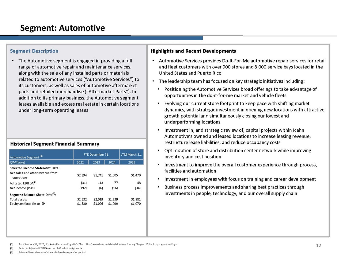 Segment: Automotive Highlights and Recent Developments • Automotive Services provides Do - It - For - Me automotive repair services for retail and fleet customers with over 900 stores and 8,000 service bays located in the United States and Puerto Rico • The leadership team has focused on key strategic initiatives including: • Positioning the Automotive Services broad offerings to take advantage of opportunities in the do - it - for - me market and vehicle fleets • Evolving our current store footprint to keep pace with shifting market dynamics, with strategic investment in opening new locations with attractive growth potential and simultaneously closing our lowest and underperforming locations • Investment in, and strategic review of, capital projects within Icahn Automotive’s owned and leased locations to increase leasing revenue, restructure lease liabilities, and reduce occupancy costs • Optimization of store and distribution center network while improving inventory and cost position • Investment to improve the overall customer experience through process, facilities and automation • Investment in employees with focus on training and career development • Business process improvements and sharing best practices through investments in people, technology, and our overall supply chain Segment Description • The Automotive segment is engaged in providing a full range of automotive repair and maintenance services, along with the sale of any installed parts or materials related to automotive services (“Automotive Services”) to its customers, as well as sales of automotive aftermarket parts and retailed merchandise (“Aftermarket Parts”). In addition to its primary business, the Automotive segment leases available and excess real estate in certain locations under long - term operating leases Historical Segment Financial Summary Selected Income Statement Data: Net sales and other revenue from $2,394 $1,741 $1,505 $1,470 operations Adjusted EBITDA (2) (31) 113 77 48 Net income (loss) (192) (6) (16) (34) Segment Balance Sheet Data (3) : Total assets $2,532 $2,019 $1,939 $1,881 Equity attributable to IEP $1,530 $1,096 $1,099 $1,070 (1) (2) (3) As of January 31, 2023, IEH Auto Parts Holdings LLC (“Auto Plus”) was deconsolidated due to voluntary Chapter 11 bankruptcy proceedings. Refer to Adjusted EBITDA reconciliation in the Appendix. Balance Sheet data as of the end of each respective period. 12 LTM March 31, FYE December 31, Automotive Segment (1) 2025 2024 2023 2022 ($Millions)