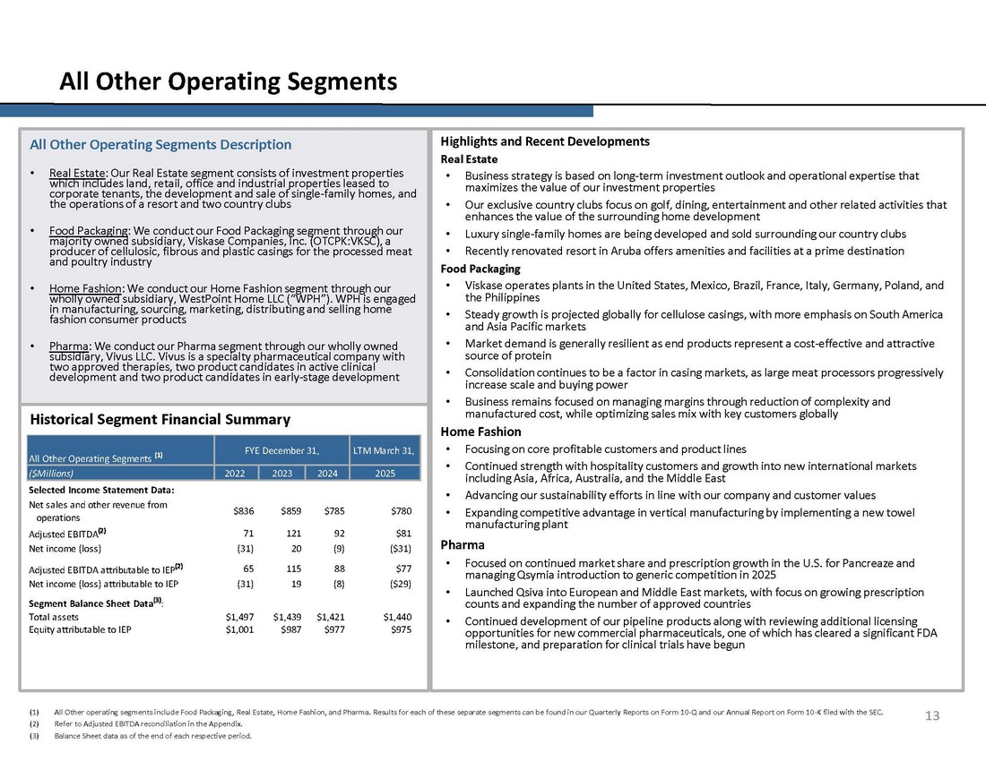 All Other Operating Segments Highlights and Recent Developments Real Estate • Business strategy is based on long - term investment outlook and operational expertise that maximizes the value of our investment properties • Our exclusive country clubs focus on golf, dining, entertainment and other related activities that enhances the value of the surrounding home development • Luxury single - family homes are being developed and sold surrounding our country clubs • Recently renovated resort in Aruba offers amenities and facilities at a prime destination Food Packaging • Viskase operates plants in the United States, Mexico, Brazil, France, Italy, Germany, Poland, and the Philippines • Steady growth is projected globally for cellulose casings, with more emphasis on South America and Asia Pacific markets • Market demand is generally resilient as end products represent a cost - effective and attractive source of protein • Consolidation continues to be a factor in casing markets, as large meat processors progressively increase scale and buying power • Business remains focused on managing margins through reduction of complexity and manufactured cost, while optimizing sales mix with key customers globally Home Fashion • Focusing on core profitable customers and product lines • Continued strength with hospitality customers and growth into new international markets including Asia, Africa, Australia, and the Middle East • Advancing our sustainability efforts in line with our company and customer values • Expanding competitive advantage in vertical manufacturing by implementing a new towel manufacturing plant Pharma • Focused on continued market share and prescription growth in the U.S. for Pancreaze and managing Qsymia introduction to generic competition in 2025 • Launched Qsiva into European and Middle East markets, with focus on growing prescription counts and expanding the number of approved countries • Continued development of our pipeline products along with reviewing additional licensing opportunities for new commercial pharmaceuticals, one of which has cleared a significant FDA milestone, and preparation for clinical trials have begun All Other Operating Segments Description • Real Estate : Our Real Estate segment consists of investment properties which includes land, retail, office and industrial properties leased to corporate tenants, the development and sale of single - family homes, and the operations of a resort and two country clubs • Food Packaging : We conduct our Food Packaging segment through our majority owned subsidiary, Viskase Companies, Inc. (OTCPK:VKSC), a producer of cellulosic, fibrous and plastic casings for the processed meat and poultry industry • Home Fashion : We conduct our Home Fashion segment through our wholly owned subsidiary, WestPoint Home LLC (“WPH”). WPH is engaged in manufacturing, sourcing, marketing, distributing and selling home fashion consumer products • Pharma : We conduct our Pharma segment through our wholly owned subsidiary, Vivus LLC. Vivus is a specialty pharmaceutical company with two approved therapies, two product candidates in active clinical development and two product candidates in early - stage development Historical Segment Financial Summary Selected Income Statement Data: Net sales and other revenue from $836 $859 $785 $780 operations Adjusted EBITDA (2) 71 121 92 $81 Net income (loss) (31) 20 (9) ($31) Adjusted EBITDA attributable to IEP (2) 65 115 88 $77 Net income (loss) attributable to IEP (31) 19 (8) ($29) Segment Balance Sheet Data (3) : Total assets $1,497 $1,439 $1,421 $1,440 Equity attributable to IEP $1,001 $987 $977 $975 (1) (2) (3) All Other operating segments include Food Packaging, Real Estate, Home Fashion, and Pharma. Results for each of these separate segments can be found in our Quarterly Reports on Form 10 - Q and our Annual Report on Form 10 - K filed with the SEC. Refer to Adjusted EBITDA reconciliation in the Appendix. Balance Sheet data as of the end of each respective period. 13 LTM March 31, FYE December 31, All Other Operating Segments (1) 2025 2024 2023 2022 ($Millions)