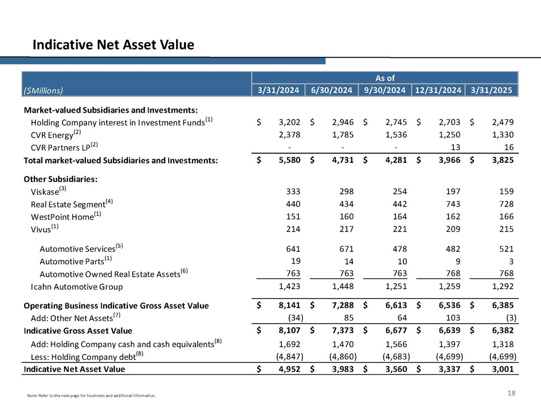 Balance Sheet 17 (1) All Other operating segments includes Food Packaging, Real Estate, Home Fashion, and Pharma. As of March 31, 2025 ($Millions) Consolidated Holding Company Pharma (1) Home Fashion (1) Real Estate (1) Food Packaging (1) Automotive Energy Investment ASSETS $2,183 $1,318 $41 $3 $38 $6 $70 $695 $12 Cash and cash equivalents 2,692 174 - 5 2 - 3 - 2,508 Cash held at consolidated affiliated partnerships and restricted cash 2,073 - - - 14 - - 20 2,039 Investments 503 - 39 26 14 77 27 320 - Accounts receivable, net 1,000 - 25 96 - 116 178 585 - Inventories, net - - - - - - - - - Related party notes receivable, net 3,824 4 - 53 350 118 815 2,484 - Property, plant and equipment, net 683 - 163 19 - 21 326 154 - Goodwill and intangible assets, net 2,523 212 6 18 94 96 462 464 1,171 Other assets $15,481 $1,708 $274 $220 $512 $434 $1,881 $4,722 $5,730 Total assets LIABILITIES AND EQUITY $4,049 $375 $59 $42 $76 $120 $783 $1,610 $984 Accounts payable, accrued expenses and other liabilities 896 - - - - - - - 896 Securities sold, not yet purchased, at fair value 6,794 4,699 - 12 1 136 28 1,918 - Debt $11,739 $5,074 $59 $54 $77 $256 $811 $3,528 $1,880 Total liabilities $1,774 ($3,366) $215 $166 $430 $164 $1,070 $616 $2,479 Equity attributable to Icahn Enterprises 1,968 - - - 5 14 - 578 1,371 Equity attributable to non - controlling interests $3,742 ($3,366) $215 $166 $435 $178 $1,070 $1,194 $3,850 Total equity $15,481 $1,708 $274 $220 $512 $434 $1,881 $4,722 $5,730 Total liabilities and equity