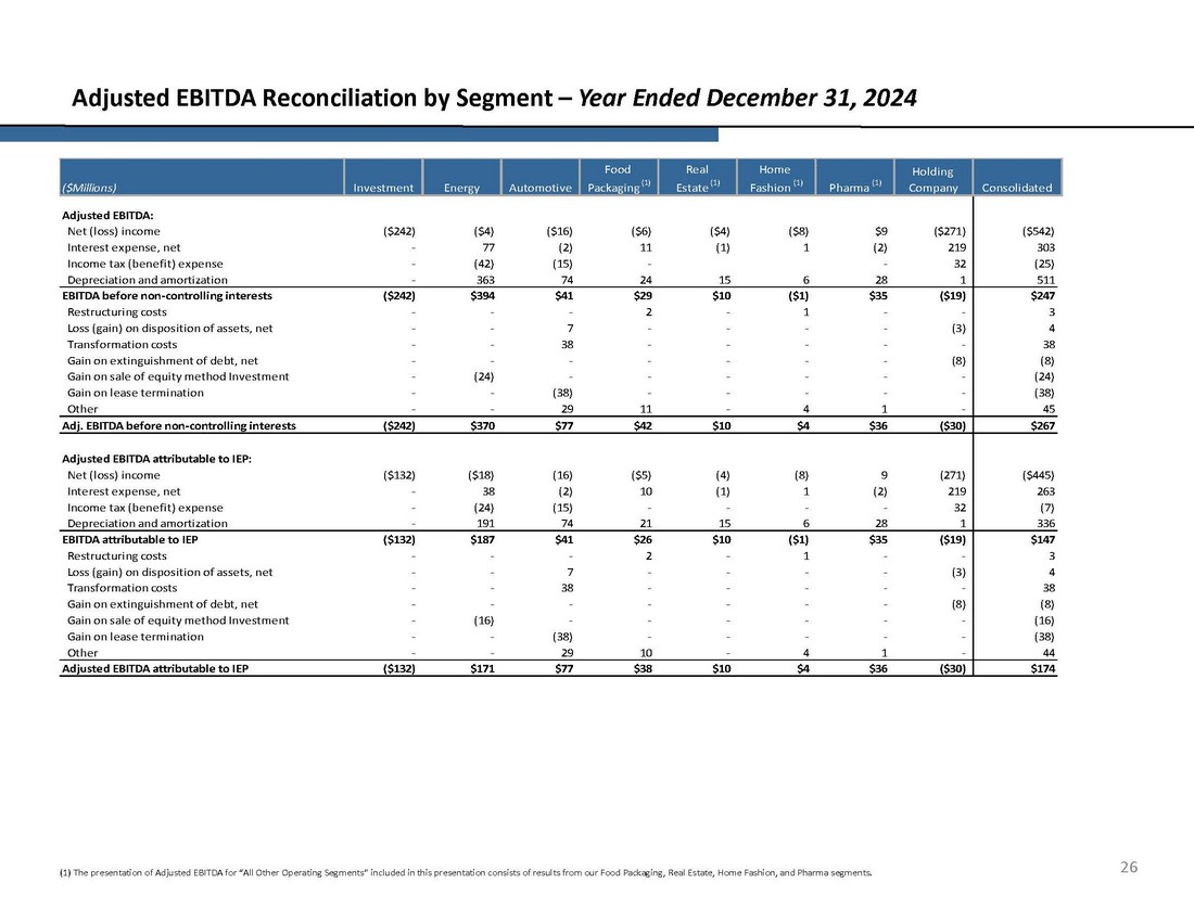 Adjusted EBITDA Reconciliation by Segment – Three Months Ended March 31, 2024 25 (1) The presentation of Adjusted EBITDA for “All Other Operating Segments” included in this presentation consists of results from our Food Packaging, Real Estate, Home Fashion, and Pharma segments. Consolidated Holding Company Pharma (1) Home Fashion (1) Real Estate (1) Food Packaging (1) Automotive Energy Investment ($Millions) Adjusted EBITDA: ($26) ($55) $1 ($1) ($2) $2 ($9) $78 ($40) Net (loss) income 73 51 - - - 3 (1) 20 - Interest expense, net 7 (3) - - - 1 (4) 13 - Income tax expense (benefit) 129 - 7 2 3 6 19 92 - Depreciation and amortization $183 ($7) $8 $1 $1 $12 $5 $203 ($40) EBITDA before non - controlling interests 5 - - - - - 5 - - Loss on disposition of assets, net 11 - - - - - 11 - - Transformation costs (2) - - - - - (2) - - Out of period adjustments 6 - - - - 2 4 - - Other $203 ($7) $8 $1 $1 $14 $23 $203 ($40) Adj. EBITDA before non - controlling interests Adjusted EBITDA attributable to IEP: ($38) ($55) $1 ($1) ($2) $2 ($9) $49 ($23) Net (loss) income 63 51 - - - 3 (1) 10 - Interest expense, net 3 (3) - - - 1 (4) 9 - Income tax expense (benefit) 86 - 7 2 3 5 19 50 - Depreciation and amortization $114 ($7) $8 $1 $1 $11 $5 $118 ($23) EBITDA attributable to IEP 5 - - - - - 5 - - Loss on disposition of assets, net 11 - - - - - 11 - - Transformation costs (2) - - - - - (2) - - Out of period adjustments 6 - - - - 2 4 - - Other $134 ($7) $8 $1 $1 $13 $23 $118 ($23) Adjusted EBITDA attributable to IEP