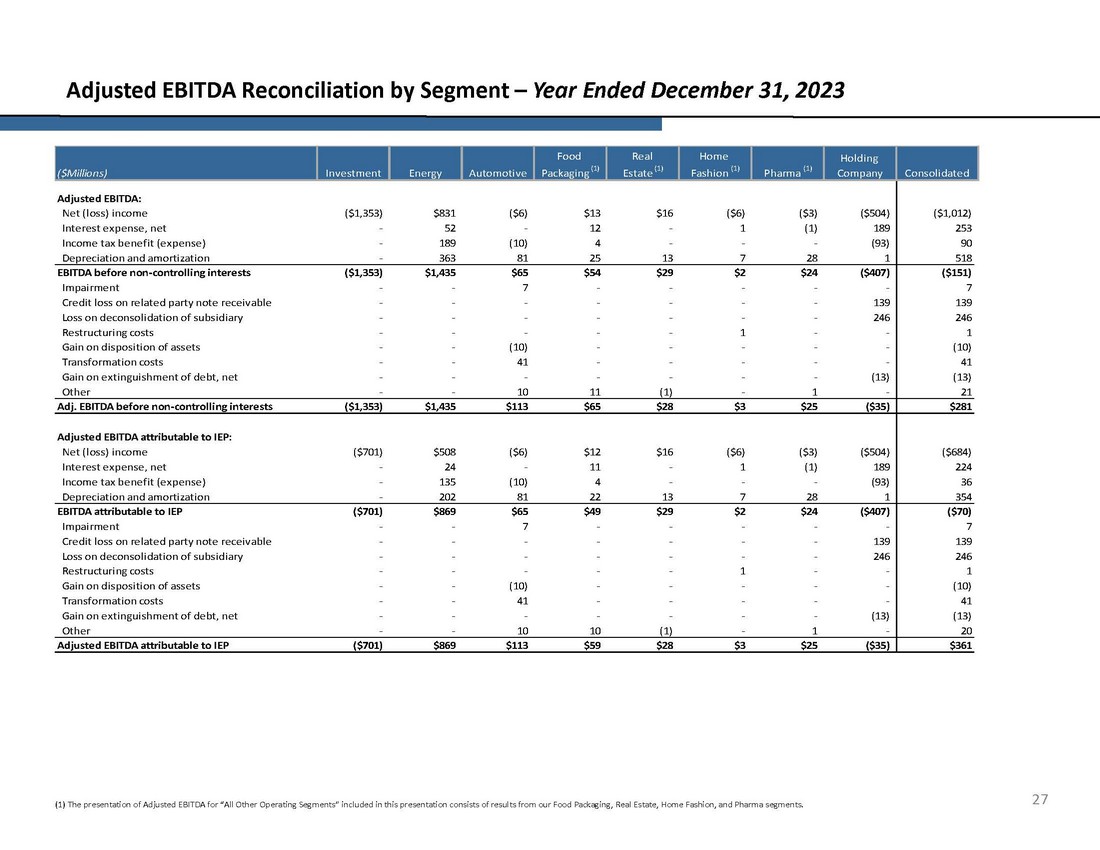Adjusted EBITDA Reconciliation by Segment – Year Ended December 31, 2024 26 (1) The presentation of Adjusted EBITDA for “All Other Operating Segments” included in this presentation consists of results from our Food Packaging, Real Estate, Home Fashion, and Pharma segments. Consolidated Holding Company Pharma (1) Home Fashion (1) Real Estate (1) Food Packaging (1) Automotive Energy Investment ($Millions) Adjusted EBITDA: ($542) ($271) $9 ($8) ($4) ($6) ($16) ($4) ($242) Net (loss) income 303 219 (2) 1 (1) 11 (2) 77 - Interest expense, net (25) 32 - - (15) (42) - Income tax (benefit) expense 511 1 28 6 15 24 74 363 - Depreciation and amortization $247 ($19) $35 ($1) $10 $29 $41 $394 ($242) EBITDA before non - controlling interests 3 - - 1 - 2 - - - Restructuring costs 4 (3) - - - - 7 - - Loss (gain) on disposition of assets, net 38 - - - - - 38 - - Transformation costs (8) (8) - - - - - - - Gain on extinguishment of debt, net (24) - - - - - - (24) - Gain on sale of equity method Investment (38) - - - - - (38) - - Gain on lease termination 45 - 1 4 - 11 29 - - Other $267 ($30) $36 $4 $10 $42 $77 $370 ($242) Adj. EBITDA before non - controlling interests Adjusted EBITDA attributable to IEP: ($445) (271) 9 (8) (4) ($5) (16) ($18) ($132) Net (loss) income 263 219 (2) 1 (1) 10 (2) 38 - Interest expense, net (7) 32 - - - - (15) (24) - Income tax (benefit) expense 336 1 28 6 15 21 74 191 - Depreciation and amortization $147 ($19) $35 ($1) $10 $26 $41 $187 ($132) EBITDA attributable to IEP 3 - - 1 - 2 - - - Restructuring costs 4 (3) - - - - 7 - - Loss (gain) on disposition of assets, net 38 - - - - - 38 - - Transformation costs (8) (8) - - - - - - - Gain on extinguishment of debt, net (16) - - - - - - (16) - Gain on sale of equity method Investment (38) - - - - - (38) - - Gain on lease termination 44 - 1 4 - 10 29 - - Other $174 ($30) $36 $4 $10 $38 $77 $171 ($132) Adjusted EBITDA attributable to IEP