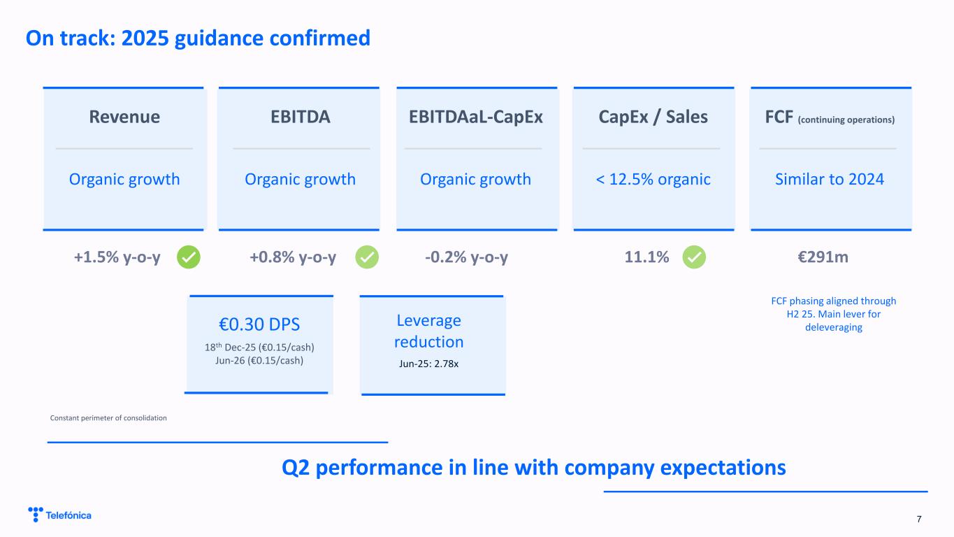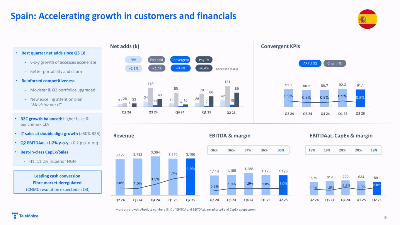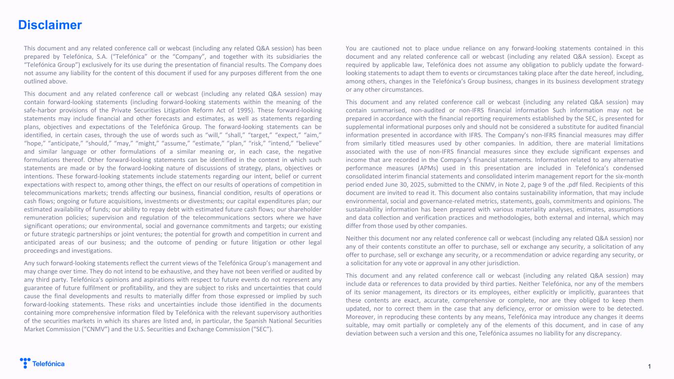 ***Este documento está clasificado como USO INTERNO por TELEFÓNICA. ***This document is classified as INTERNAL USE by TELEFÓNICA. Disclaimer This document and any related conference call or webcast (including any related Q&A session) has been prepared by Telefónica, S.A. (“Telefónica” or the “Company”, and together with its subsidiaries the “Telefónica Group”) exclusively for its use during the presentation of financial results. The Company does not assume any liability for the content of this document if used for any purposes different from the one outlined above. This document and any related conference call or webcast (including any related Q&A session) may contain forward-looking statements (including forward-looking statements within the meaning of the safe-harbor provisions of the Private Securities Litigation Reform Act of 1995). These forward-looking statements may include financial and other forecasts and estimates, as well as statements regarding plans, objectives and expectations of the Telefónica Group. The forward-looking statements can be identified, in certain cases, through the use of words such as “will,” “shall,” “target,” “expect,” “aim,” “hope,” “anticipate,” “should,” “may,” “might,” “assume,” “estimate,” “plan,” “risk,” “intend,” “believe” and similar language or other formulations of a similar meaning or, in each case, the negative formulations thereof. Other forward-looking statements can be identified in the context in which such statements are made or by the forward-looking nature of discussions of strategy, plans, objectives or intentions. These forward-looking statements include statements regarding our intent, belief or current expectations with respect to, among other things, the effect on our results of operations of competition in telecommunications markets; trends affecting our business, financial condition, results of operations or cash flows; ongoing or future acquisitions, investments or divestments; our capital expenditures plan; our estimated availability of funds; our ability to repay debt with estimated future cash flows; our shareholder remuneration policies; supervision and regulation of the telecommunications sectors where we have significant operations; our environmental, social and governance commitments and targets; our existing or future strategic partnerships or joint ventures; the potential for growth and competition in current and anticipated areas of our business; and the outcome of pending or future litigation or other legal proceedings and investigations. Any such forward-looking statements reflect the current views of the Telefónica Group’s management and may change over time. They do not intend to be exhaustive, and they have not been verified or audited by any third party. Telefónica's opinions and aspirations with respect to future events do not represent any guarantee of future fulfilment or profitability, and they are subject to risks and uncertainties that could cause the final developments and results to materially differ from those expressed or implied by such forward-looking statements. These risks and uncertainties include those identified in the documents containing more comprehensive information filed by Telefónica with the relevant supervisory authorities of the securities markets in which its shares are listed and, in particular, the Spanish National Securities Market Commission (“CNMV”) and the U.S. Securities and Exchange Commission (“SEC”). You are cautioned not to place undue reliance on any forward-looking statements contained in this document and any related conference call or webcast (including any related Q&A session). Except as required by applicable law, Telefónica does not assume any obligation to publicly update the forward- looking statements to adapt them to events or circumstances taking place after the date hereof, including, among others, changes in the Telefónica’s Group business, changes in its business development strategy or any other circumstances. This document and any related conference call or webcast (including any related Q&A session) may contain summarised, non-audited or non-IFRS financial information Such information may not be prepared in accordance with the financial reporting requirements established by the SEC, is presented for supplemental informational purposes only and should not be considered a substitute for audited financial information presented in accordance with IFRS. The Company’s non-IFRS financial measures may differ from similarly titled measures used by other companies. In addition, there are material limitations associated with the use of non-IFRS financial measures since they exclude significant expenses and income that are recorded in the Company’s financial statements. Information related to any alternative performance measures (APMs) used in this presentation are included in Telefónica’s condensed consolidated interim financial statements and consolidated interim management report for the six-month period ended June 30, 2025, submitted to the CNMV, in Note 2, page 9 of the .pdf filed. Recipients of this document are invited to read it. This document also contains sustainability information, that may include environmental, social and governance-related metrics, statements, goals, commitments and opinions. The sustainability information has been prepared with various materiality analyses, estimates, assumptions and data collection and verification practices and methodologies, both external and internal, which may differ from those used by other companies. Neither this document nor any related conference call or webcast (including any related Q&A session) nor any of their contents constitute an offer to purchase, sell or exchange any security, a solicitation of any offer to purchase, sell or exchange any security, or a recommendation or advice regarding any security,