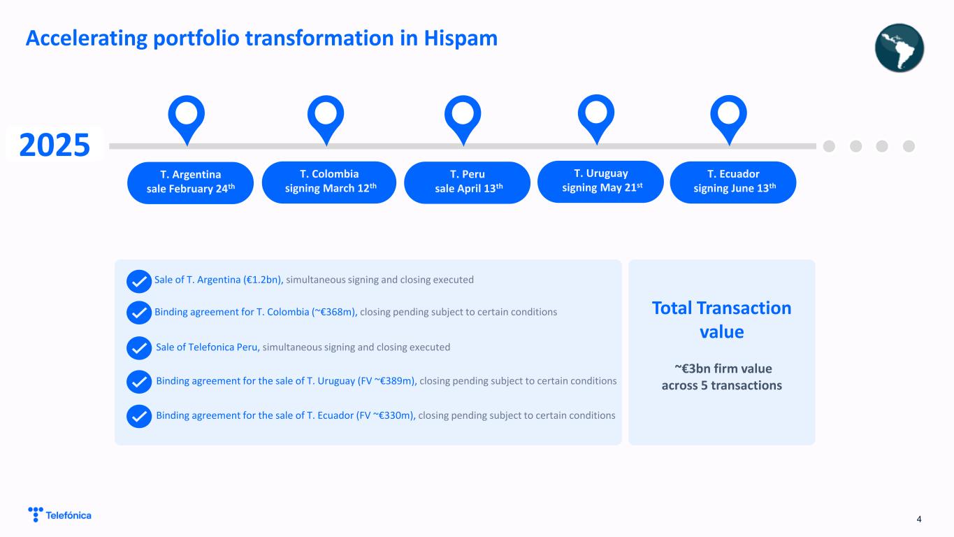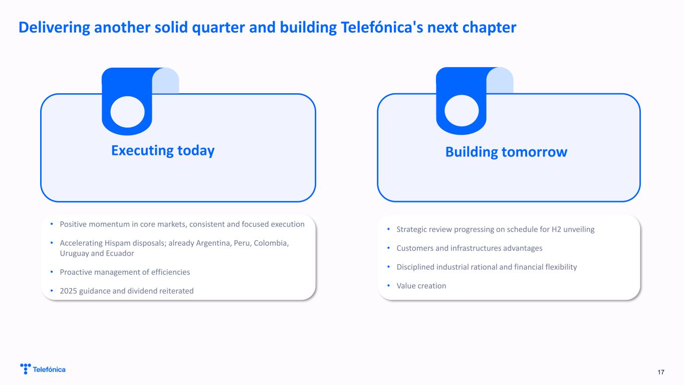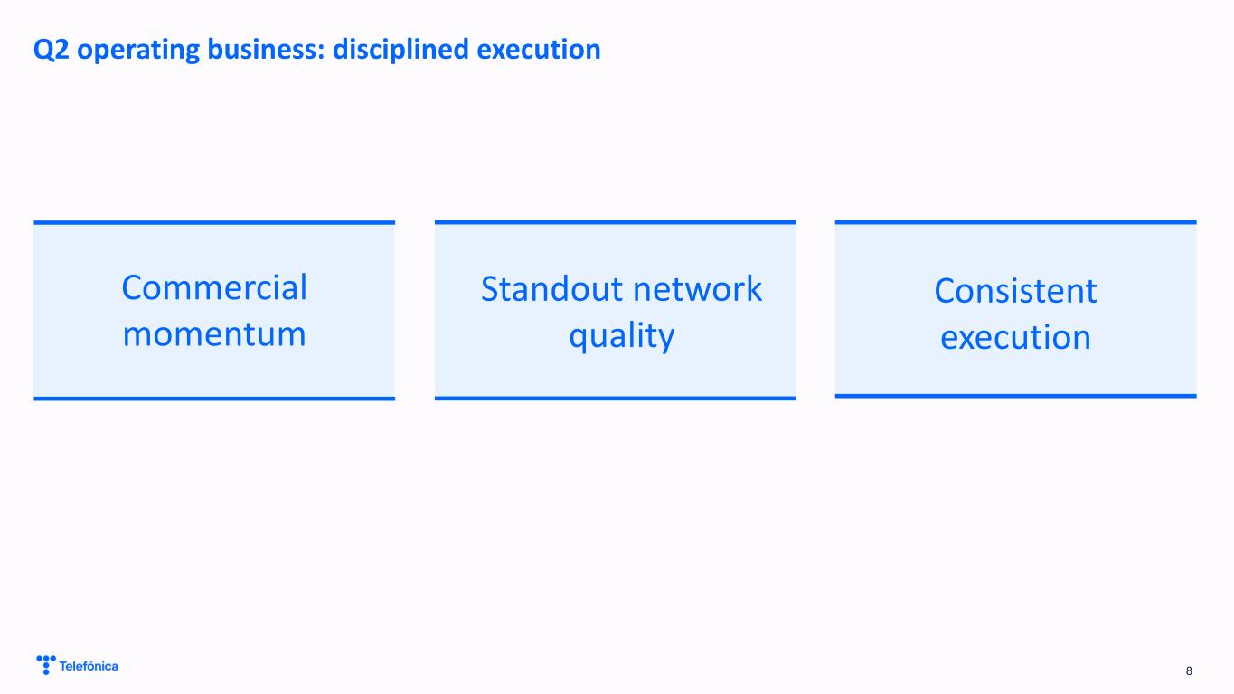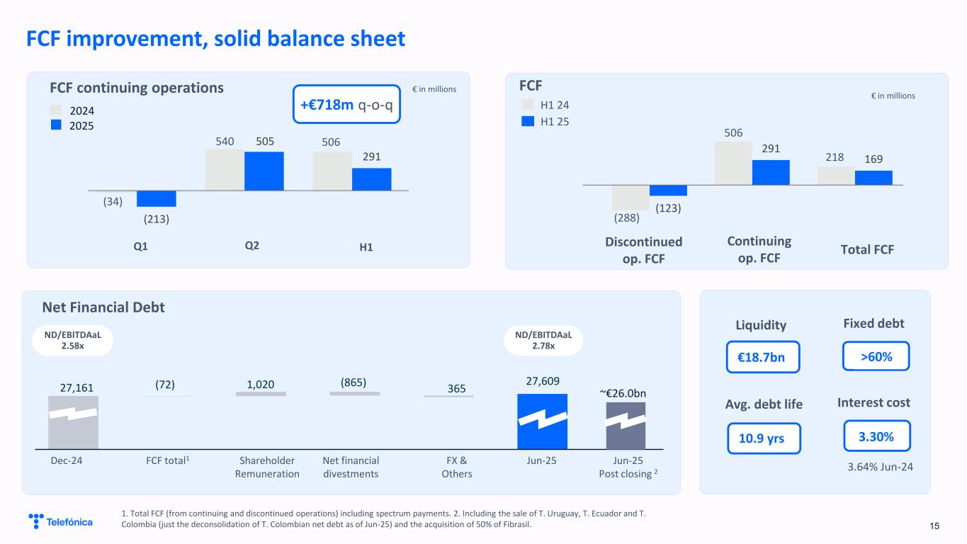 ***Este documento está clasificado como USO INTERNO por TELEFÓNICA. ***This document is classified as INTERNAL USE by TELEFÓNICA. Disclaimer This document and any related conference call or webcast (including any related Q&A session) has been prepared by Telefónica, S.A. (“Telefónica” or the “Company”, and together with its subsidiaries the “Telefónica Group”) exclusively for its use during the presentation of financial results. The Company does not assume any liability for the content of this document if used for any purposes different from the one outlined above. This document and any related conference call or webcast (including any related Q&A session) may contain forward-looking statements (including forward-looking statements within the meaning of the safe-harbor provisions of the Private Securities Litigation Reform Act of 1995). These forward-looking statements may include financial and other forecasts and estimates, as well as statements regarding plans, objectives and expectations of the Telefónica Group. The forward-looking statements can be identified, in certain cases, through the use of words such as “will,” “shall,” “target,” “expect,” “aim,” “hope,” “anticipate,” “should,” “may,” “might,” “assume,” “estimate,” “plan,” “risk,” “intend,” “believe” and similar language or other formulations of a similar meaning or, in each case, the negative formulations thereof. Other forward-looking statements can be identified in the context in which such statements are made or by the forward-looking nature of discussions of strategy, plans, objectives or intentions. These forward-looking statements include statements regarding our intent, belief or current expectations with respect to, among other things, the effect on our results of operations of competition in telecommunications markets; trends affecting our business, financial condition, results of operations or cash flows; ongoing or future acquisitions, investments or divestments; our capital expenditures plan; our estimated availability of funds; our ability to repay debt with estimated future cash flows; our shareholder remuneration policies; supervision and regulation of the telecommunications sectors where we have significant operations; our environmental, social and governance commitments and targets; our existing or future strategic partnerships or joint ventures; the potential for growth and competition in current and anticipated areas of our business; and the outcome of pending or future litigation or other legal proceedings and investigations. Any such forward-looking statements reflect the current views of the Telefónica Group’s management and may change over time. They do not intend to be exhaustive, and they have not been verified or audited by any third party. Telefónica's opinions and aspirations with respect to future events do not represent any guarantee of future fulfilment or profitability, and they are subject to risks and uncertainties that could cause the final developments and results to materially differ from those expressed or implied by such forward-looking statements. These risks and uncertainties include those identified in the documents containing more comprehensive information filed by Telefónica with the relevant supervisory authorities of the securities markets in which its shares are listed and, in particular, the Spanish National Securities Market Commission (“CNMV”) and the U.S. Securities and Exchange Commission (“SEC”). You are cautioned not to place undue reliance on any forward-looking statements contained in this document and any related conference call or webcast (including any related Q&A session). Except as required by applicable law, Telefónica does not assume any obligation to publicly update the forward- looking statements to adapt them to events or circumstances taking place after the date hereof, including, among others, changes in the Telefónica’s Group business, changes in its business development strategy or any other circumstances. This document and any related conference call or webcast (including any related Q&A session) may contain summarised, non-audited or non-IFRS financial information Such information may not be prepared in accordance with the financial reporting requirements established by the SEC, is presented for supplemental informational purposes only and should not be considered a substitute for audited financial information presented in accordance with IFRS. The Company’s non-IFRS financial measures may differ from similarly titled measures used by other companies. In addition, there are material limitations associated with the use of non-IFRS financial measures since they exclude significant expenses and income that are recorded in the Company’s financial statements. Information related to any alternative performance measures (APMs) used in this presentation are included in Telefónica’s condensed consolidated interim financial statements and consolidated interim management report for the six-month period ended June 30, 2025, submitted to the CNMV, in Note 2, page 9 of the .pdf filed. Recipients of this document are invited to read it. This document also contains sustainability information, that may include environmental, social and governance-related metrics, statements, goals, commitments and opinions. The sustainability information has been prepared with various materiality analyses, estimates, assumptions and data collection and verification practices and methodologies, both external and internal, which may differ from those used by other companies. Neither this document nor any related conference call or webcast (including any related Q&A session) nor any of their contents constitute an offer to purchase, sell or exchange any security, a solicitation of any offer to purchase, sell or exchange any security, or a recommendation or advice regarding any security,
