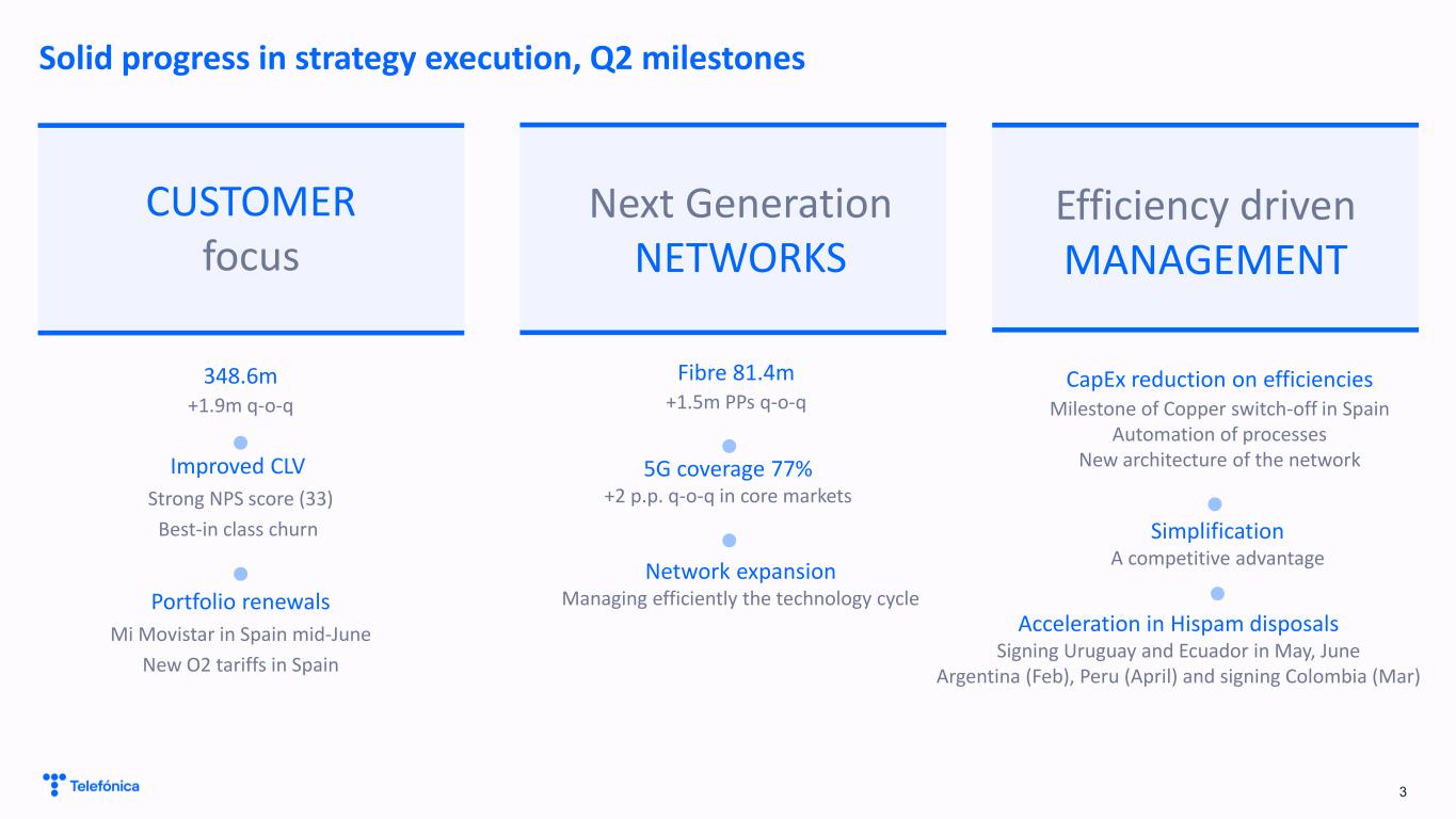 ***Este documento está clasificado como USO INTERNO por TELEFÓNICA. ***This document is classified as INTERNAL USE by TELEFÓNICA. Solid progress in strategy execution, Q2 milestones CapEx reduction on efficiencies Milestone of Copper switch-off in Spain Automation of processes New architecture of the network Acceleration in Hispam disposals Signing Uruguay and Ecuador in May, June Argentina (Feb), Peru (April) and signing Colombia (Mar) CUSTOMER focus 348.6m +1.9m q-o-q Improved CLV Strong NPS score (33) Best-in class churn Next Generation NETWORKS Efficiency driven MANAGEMENT Portfolio renewals Mi Movistar in Spain mid-June New O2 tariffs in Spain Fibre 81.4m +1.5m PPs q-o-q 5G coverage 77% +2 p.p. q-o-q in core markets Network expansion Managing efficiently the technology cycle Simplification A competitive advantage 3