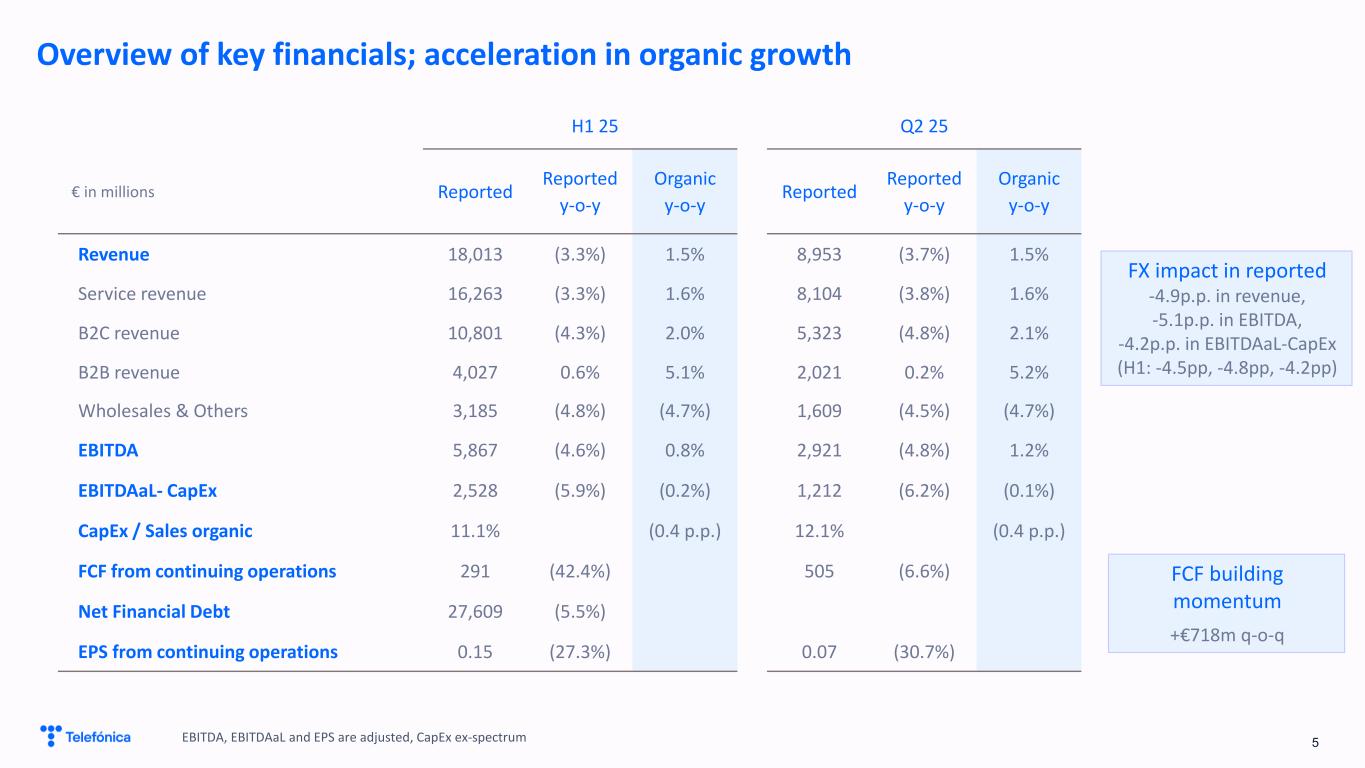 ***Este documento está clasificado como USO INTERNO por TELEFÓNICA. ***This document is classified as INTERNAL USE by TELEFÓNICA. H1 25 Q2 25 € in millions Reported Reported y-o-y Organic y-o-y Reported Reported y-o-y Organic y-o-y Revenue 18,013 (3.3%) 1.5% 8,953 (3.7%) 1.5% Service revenue 16,263 (3.3%) 1.6% 8,104 (3.8%) 1.6% B2C revenue 10,801 (4.3%) 2.0% 5,323 (4.8%) 2.1% B2B revenue 4,027 0.6% 5.1% 2,021 0.2% 5.2% Wholesales & Others 3,185 (4.8%) (4.7%) 1,609 (4.5%) (4.7%) EBITDA 5,867 (4.6%) 0.8% 2,921 (4.8%) 1.2% EBITDAaL- CapEx 2,528 (5.9%) (0.2%) 1,212 (6.2%) (0.1%) CapEx / Sales organic 11.1% (0.4 p.p.) 12.1% (0.4 p.p.) FCF from continuing operations 291 (42.4%) 505 (6.6%) Net Financial Debt 27,609 (5.5%) EPS from continuing operations 0.15 (27.3%) 0.07 (30.7%) EBITDA, EBITDAaL and EPS are adjusted, CapEx ex-spectrum FCF building momentum +€718m q-o-q Overview of key financials; acceleration in organic growth FX impact in reported -4.9p.p. in revenue, -5.1p.p. in EBITDA, -4.2p.p. in EBITDAaL-CapEx (H1: -4.5pp, -4.8pp, -4.2pp) 5