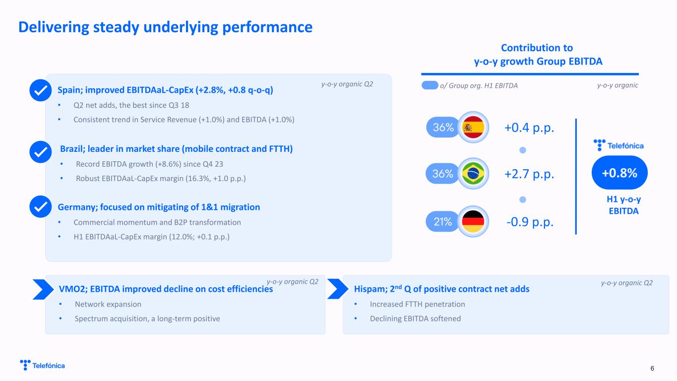***Este documento está clasificado como USO INTERNO por TELEFÓNICA. ***This document is classified as INTERNAL USE by TELEFÓNICA. 36% 21% 36% Delivering steady underlying performance Spain; improved EBITDAaL-CapEx (+2.8%, +0.8 q-o-q) • Q2 net adds, the best since Q3 18 • Consistent trend in Service Revenue (+1.0%) and EBITDA (+1.0%) Brazil; leader in market share (mobile contract and FTTH) • Record EBITDA growth (+8.6%) since Q4 23 • Robust EBITDAaL-CapEx margin (16.3%, +1.0 p.p.) Germany; focused on mitigating of 1&1 migration • Commercial momentum and B2P transformation • H1 EBITDAaL-CapEx margin (12.0%; +0.1 p.p.) Hispam; 2nd Q of positive contract net adds • Increased FTTH penetration • Declining EBITDA softened y-o-y organic Q2 +0.4 p.p. +0.8% Contribution to y-o-y growth Group EBITDA +2.7 p.p. -0.9 p.p. o/ Group org. H1 EBITDA H1 y-o-y EBITDA y-o-y organic y-o-y organic Q2 VMO2; EBITDA improved decline on cost efficiencies • Network expansion • Spectrum acquisition, a long-term positive y-o-y organic Q2 6