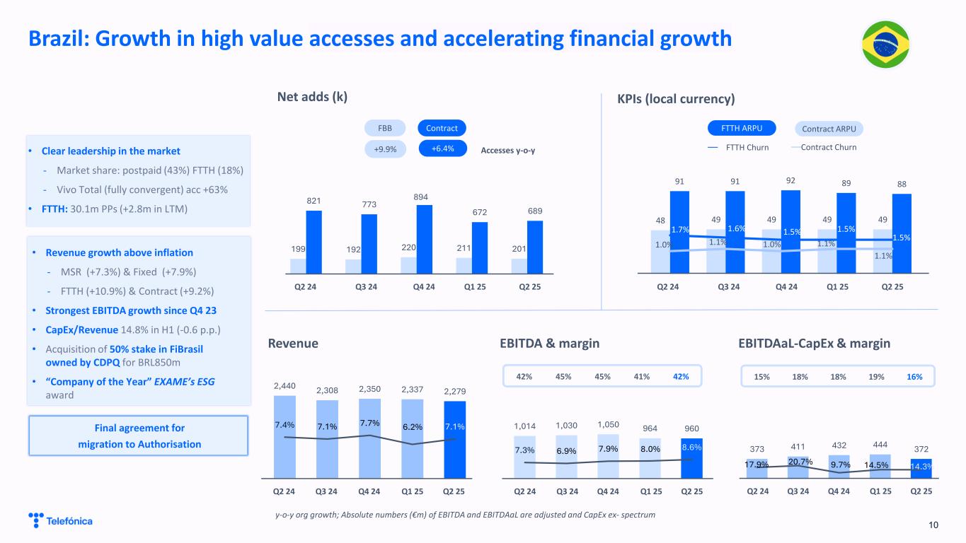 ***Este documento está clasificado como USO INTERNO por TELEFÓNICA. ***This document is classified as INTERNAL USE by TELEFÓNICA. Final agreement for migration to Authorisation Revenue EBITDA & margin EBITDAaL-CapEx & margin • Clear leadership in the market - Market share: postpaid (43%) FTTH (18%) - Vivo Total (fully convergent) acc +63% • FTTH: 30.1m PPs (+2.8m in LTM) Brazil: Growth in high value accesses and accelerating financial growth 2,440 2,308 2,350 2,337 2,279 7.4% 7.1% 7.7% 6.2% 7.1% 1,014 1,030 1,050 964 960 7.3% 6.9% 7.9% 8.0% 8.6% 373 411 432 444 372 17.9% 20.7% 9.7% 14.5% 14.3% Net adds (k) ContractFBB KPIs (local currency) +9.9% Accesses y-o-y+6.4% 199 192 220 211 201 821 773 894 672 689 • Revenue growth above inflation - MSR (+7.3%) & Fixed (+7.9%) - FTTH (+10.9%) & Contract (+9.2%) • Strongest EBITDA growth since Q4 23 • CapEx/Revenue 14.8% in H1 (-0.6 p.p.) • Acquisition of 50% stake in FiBrasil owned by CDPQ for BRL850m • “Company of the Year” EXAME’s ESG award 48 49 49 49 49 91 91 92 89 88 1.0% 1.1% 1.0% 1.1% 1.1% 1.7% 1.6% 1.5% 1.5% 1.5% Q2 24 Q3 24 Q4 24 Q1 25 Contract ARPUFTTH ARPU 42% 45% 42%41%45% 15% 18% 16%19%18% y-o-y org growth; Absolute numbers (€m) of EBITDA and EBITDAaL are adjusted and CapEx ex- spectrum Q2 25Q2 24 Q3 24 Q4 24 Q1 25 Q2 25 Q2 24 Q3 24 Q4 24 Q1 25 Q2 25 Q2 24 Q3 24 Q4 24 Q1 25 Q2 25 Q2 24 Q3 24 Q4 24 Q1 25 Q2 25 FTTH Churn Contract Churn 10