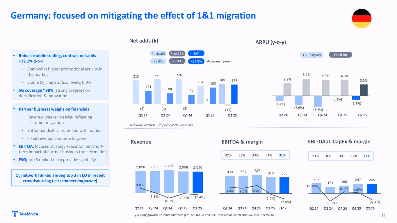 ***Este documento está clasificado como USO INTERNO por TELEFÓNICA. ***This document is classified as INTERNAL USE by TELEFÓNICA. O2 Postpaid Fixed BB Net adds exclude 3rd party MNO-accesses 262 171 199 247 246 16.1% (9.0%) 6.1% 4.8% (6.3%)-10.0% -5.0% 0.0 % 5.0 % 10.0% 15.0% 20.0% 25.0% 30.0% 35.0% 40.0% -200 -100 0 100 200 300 400 500 Accesses (y-o-y) Postpaid +6.9% Fixed BB IoT +24.9% 2,090 2,098 2,205 2,056 2,040 0.0% (1.6%) (3.7%) (2.0%) (2.4%) -5.0% 0.0 % 5.0 % -800 -300 200 700 1,2 00 1,7 00 2,2 00 2,7 00 Revenue EBITDA & margin EBITDAaL-CapEx & margin • Robust mobile trading, contract net adds +12.1% q-o-q - Somewhat higher promotional activity in the market - Stable O2 churn at low levels, 0.9% • 5G coverage ~98%; strong progress on densification & innovation • Partner business weighs on financials - Revenue weaker on MSR reflecting customer migration - Softer handset sales; in-line with market - Fixed revenue continue to grow • EBITDA; focused strategy execution but short- term impact of partner business transformation • ESG; top 5 ranked telco providers globally O2 network ranked among top 3 in EU in recent crowdsourcing test (connect magazine) Net adds (k) ARPU (y-o-y) Germany: focused on mitigating the effect of 1&1 migration 215 226 226 164 184 (4) (6) (2) 0 (15) 121 98 84 150 177 (1.4%) (2.6%) (3.2%) (0.1%) (1.1%) 3.8% 5.2% 4.9% 4.8% 3.5% Q2 24 Q3 24 Q4 24 Q1 25 Q2 25 679 694 737 640 638 3.8% 3.0% 5.3% (2.0%) (6.0%) -6.0% -1.0% 4.0 % 9.0 % 14.0% 19.0% -200 0 200 400 600 800 1,0 00 Q2 24 Q3 24 Q4 24 Q1 25 Q2 25 32% 33% 31%31%33% 13% 8% 12%12%9% Q2 24 Q3 24 Q4 24 Q1 25 Q2 25 Q2 24 Q3 24 Q4 24 Q1 25 Q2 25 y-o-y org growth; Absolute numbers (€m) of EBITDA and EBITDAaL are adjusted and CapEx ex- spectrum Q2 24 Q3 24 Q4 24 Q1 25 Q2 25 -1.0% 11