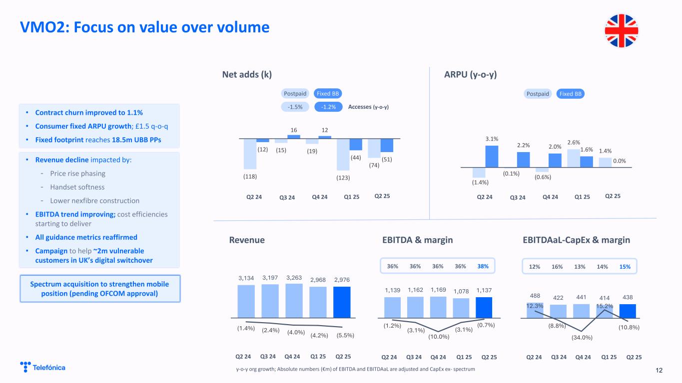 ***Este documento está clasificado como USO INTERNO por TELEFÓNICA. ***This document is classified as INTERNAL USE by TELEFÓNICA. • Contract churn improved to 1.1% • Consumer fixed ARPU growth; £1.5 q-o-q • Fixed footprint reaches 18.5m UBB PPs • Revenue decline impacted by: - Price rise phasing - Handset softness - Lower nexfibre construction • EBITDA trend improving; cost efficiencies starting to deliver • All guidance metrics reaffirmed • Campaign to help ~2m vulnerable customers in UK’s digital switchover Spectrum acquisition to strengthen mobile position (pending OFCOM approval) (1.4%) (0.1%) (0.6%) 2.6% 1.4% 3.1% 2.2% 2.0% 1.6% 0.0% Q2 24 Q3 24 Q4 24 Q1 25 Q2 25 (118) (15) (19) (123) (74) (12) 16 12 (44) (51) 36% 36% 38%36%36% 12% 16% 15%14%13% Revenue EBITDA & margin EBITDAaL-CapEx & margin 488 422 441 414 438 12.3% (8.8%) (34.0%) 15.2% (10.8%) -40.0% -20.0% 0.0 % 20.0% 40.0% 60.0% -500 -300 -100 100 300 500 700 900 1,1 00 3,134 3,197 3,263 2,968 2,976 (1.4%) (2.4%) (4.0%) (4.2%) (5.5%) -19.0% -14.0% -9.0% -4.0% 1.0 % 6.0 % 11.0% 16.0% 21.0% 26.0% -2,500 -1,500 -500 500 1,5 00 2,5 00 3,5 00 1,139 1,162 1,169 1,078 1,137 (1.2%) (3.1%) (10.0%) (3.1%) (0.7%) -15.0% -10.0% -5.0% 0.0 % 5.0 % 10.0% 15.0% 20.0% 25.0% -1,100 -600 -100 400 900 1,4 00 ARPU (y-o-y) Accesses (y-o-y) Postpaid -1.5% Fixed BB Net adds (k) Postpaid Fixed BB Q2 24 Q3 24 Q4 24 Q1 25 Q2 25 Q2 24 Q3 24 Q4 24 Q1 25 Q2 25 Q2 24 Q3 24 Q4 24 Q1 25 Q2 25 VMO2: Focus on value over volume y-o-y org growth; Absolute numbers (€m) of EBITDA and EBITDAaL are adjusted and CapEx ex- spectrum Q2 24 Q3 24 Q4 24 Q1 25 Q2 25 -1.2% 12