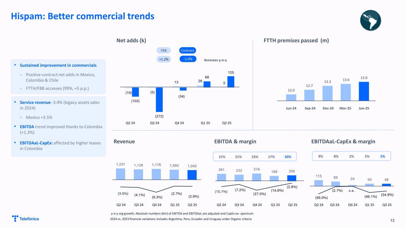 ***Este documento está clasificado como USO INTERNO por TELEFÓNICA. ***This document is classified as INTERNAL USE by TELEFÓNICA. • Sustained improvement in commercials - Positive contract net adds in Mexico, Colombia & Chile - FTTH/FBB accesses (99%, +5 p.p.) FTTH premises passed (m) Hispam: Better commercial trends Net adds (k) ContractFBB +1.2% Accesses y-o-y-1.0% (10) (5) 13 26 3 (102) (272) (34) 68 125 Q2 24 Q3 24 Q4 24 Q1 25 Q2 25 12.0 12.7 13.3 13.6 13.9 Jun-24 Sep-24 Dec-24 Mar-25 Jun-25 • Service revenue -3.4% (legacy assets sales in 2024) - Mexico +3.5% • EBITDA trend improved thanks to Colombia (+1.3%) • EBITDAaL-CapEx: affected by higher leases in Colombia Revenue EBITDA & margin EBITDAaL-CapEx & margin 1,231 1,128 1,176 1,093 1,042 (3.5%) (4.1%) (9.3%) (2.7%) (2.9%) 261 232 274 189 208 (15.1%) (7.2%) (27.5%) (14.8%) (2.8%) 115 89 24 50 48 (56.0%) (2.7%) c.s. (46.1%) (34.9%) 21% 21% 20%17%23% 9% 8% 5%5%2% 2024 vs. 2023 financial variations includes Argentina, Peru, Ecuador and Uruguay under Organic criteria Q2 24 Q3 24 Q4 24 Q1 25 Q2 25 Q2 24 Q3 24 Q4 24 Q1 25 Q2 25 Q2 24 Q3 24 Q4 24 Q1 25 Q2 25 y-o-y org growth; Absolute numbers (€m) of EBITDA and EBITDAaL are adjusted and CapEx ex- spectrum 13