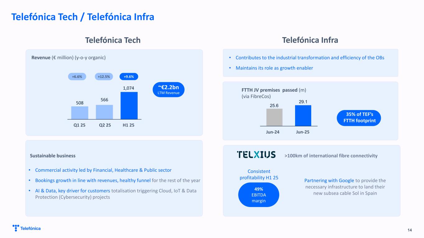 ***Este documento está clasificado como USO INTERNO por TELEFÓNICA. ***This document is classified as INTERNAL USE by TELEFÓNICA. Revenue (€ million) (y-o-y organic) • Commercial activity led by Financial, Healthcare & Public sector • Bookings growth in line with revenues, healthy funnel for the rest of the year • AI & Data, key driver for customers totalisation triggering Cloud, IoT & Data Protection (Cybersecurity) projects Sustainable business Telefónica Tech / Telefónica Infra Telefónica Tech >100km of international fibre connectivity 49% EBITDA margin Consistent profitability H1 25 Partnering with Google to provide the necessary infrastructure to land their new subsea cable Sol in Spain • Contributes to the industrial transformation and efficiency of the OBs • Maintains its role as growth enabler Telefónica Infra 508 566 Q1 25 Q2 25 H1 25 1,074 +9.6%+6.6% +12.5% ~€2.2bn LTM Revenue FTTH JV premises passed (m) (via FibreCos) 25.6 29.1 Jun-24 Jun-25 35% of TEF’s FTTH footprint 14