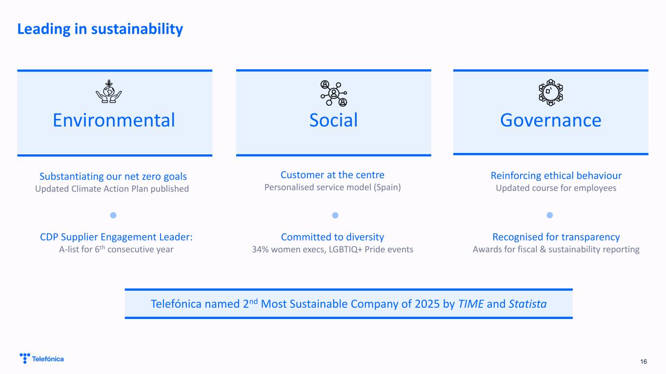 ***Este documento está clasificado como USO INTERNO por TELEFÓNICA. ***This document is classified as INTERNAL USE by TELEFÓNICA. FCF continuing operations (34) 540 506 (213) 505 291 Q1 Q2 H1 2024 2025 (288) 506 218 (123) 291 169 Discontinued op. FCF H1 24 H1 25 Continuing op. FCF Total FCF +€718m q-o-q FCF improvement, solid balance sheet FCF €18.7bn Liquidity 10.9 yrs Avg. debt life 3.30% Interest cost 3.64% Jun-24 >60% Fixed debt Net Financial Debt 1. Total FCF (from continuing and discontinued operations) including spectrum payments. 2. Including the sale of T. Uruguay, T. Ecuador and T. Colombia (just the deconsolidation of T. Colombian net debt as of Jun-25) and the acquisition of 50% of Fibrasil. 27,161 (72) 1,020 ND/EBITDAaL 2.78x Dec-24 FCF total1 Jun-25FX & Others Net financial divestments Shareholder Remuneration 27,609(865) 365 ND/EBITDAaL 2.58x Jun-25 Post closing 2 ~€26.0bn € in millions 15 € in millions