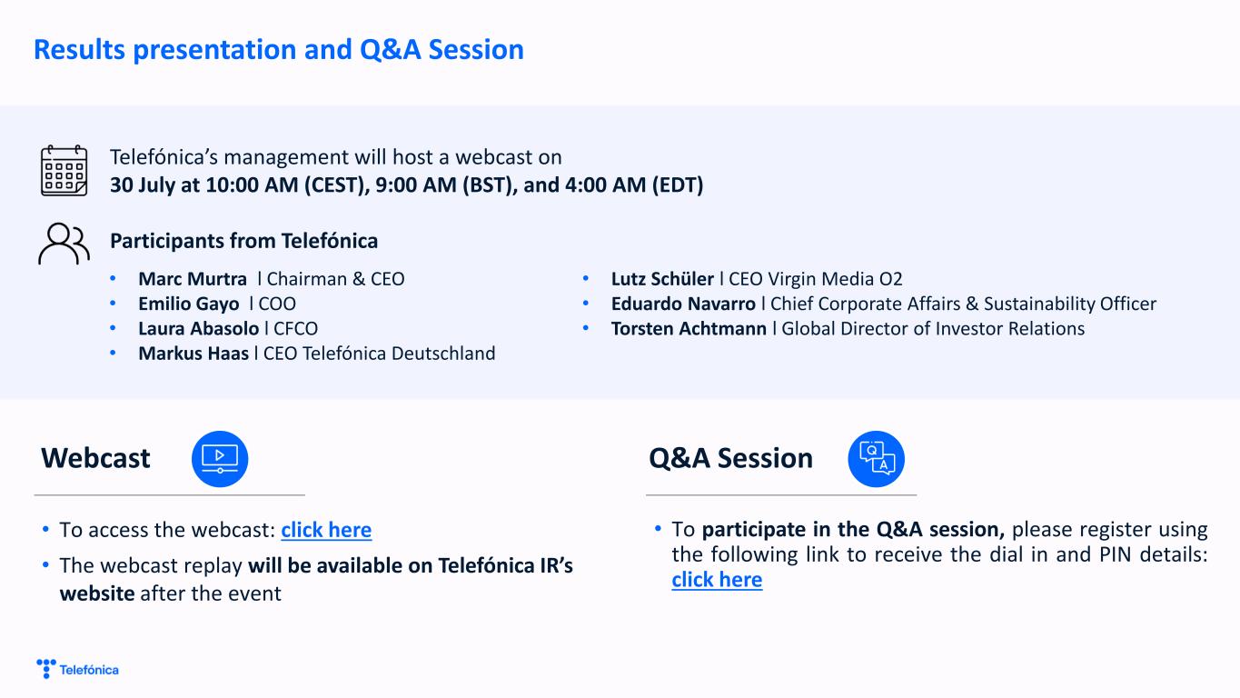 ***Este documento está clasificado como USO INTERNO por TELEFÓNICA. ***This document is classified as INTERNAL USE by TELEFÓNICA. Telefónica’s management will host a webcast on 30 July at 10:00 AM (CEST), 9:00 AM (BST), and 4:00 AM (EDT) Participants from Telefónica • To access the webcast: click here • The webcast replay will be available on Telefónica IR’s website after the event • To participate in the Q&A session, please register using the following link to receive the dial in and PIN details: click here • Marc Murtra l Chairman & CEO • Emilio Gayo l COO • Laura Abasolo l CFCO • Markus Haas l CEO Telefónica Deutschland • Lutz Schüler l CEO Virgin Media O2 • Eduardo Navarro l Chief Corporate Affairs & Sustainability Officer • Torsten Achtmann l Global Director of Investor Relations Webcast Q&A Session Results presentation and Q&A Session