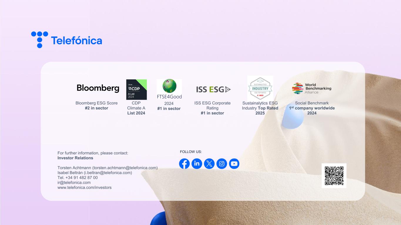 ***Este documento está clasificado como USO INTERNO por TELEFÓNICA. ***This document is classified as INTERNAL USE by TELEFÓNICA. CDP Climate A List 2024 ISS ESG Corporate Rating #1 in sector Social Benchmark 1st company worldwide 2024 2024 #1 in sector Sustainalytics ESG Industry Top Rated 2025 Bloomberg ESG Score #2 in sector For further information, please contact: Investor Relations Torsten Achtmann (torsten.achtmann@telefonica.com) Isabel Beltrán (i.beltran@telefonica.com) Tel. +34 91 482 87 00 ir@telefonica.com www.telefonica.com/investors FOLLOW US:
