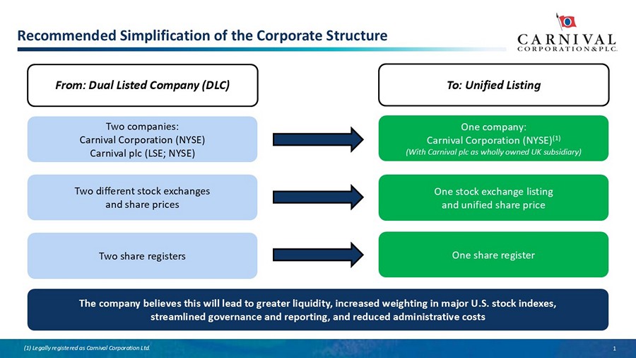 1 Recommended Simplification of the Corporate Structure From: Dual Listed Company (DLC) Two companies: Carnival Corporation (NYSE) Carnival plc (LSE; NYSE) Two different stock exchanges and share prices Two share registers One company: Carnival Corporation (NYSE) (1) (With Carnival plc as wholly owned UK subsidiary) One stock exchange listing and unified share price One share register The company believes this will lead to greater liquidity, increased weighting in major U.S. stock indexes, streamlined governance and reporting, and reduced administrative costs To: Unified Listing (1) Legally registered as Carnival Corporation Ltd.