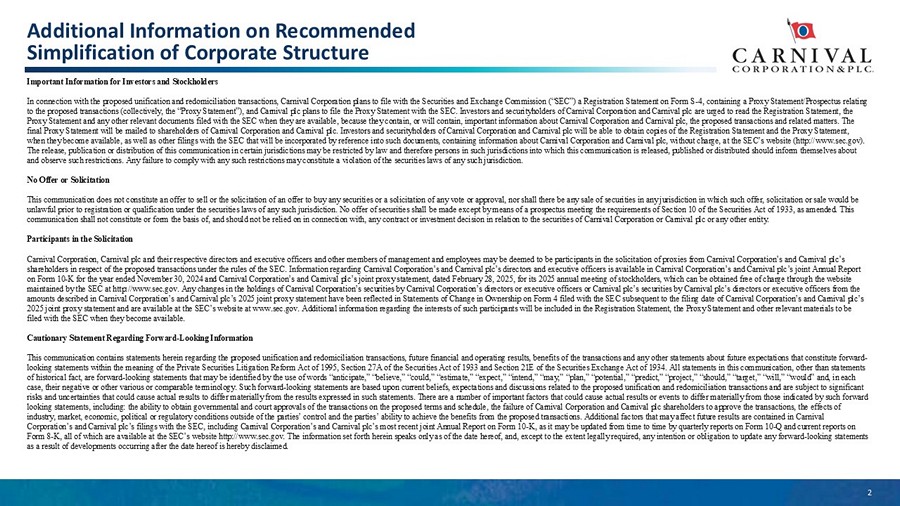 2 Additional Information on Recommended Simplification of Corporate Structure Important Information for Investors and Stockholders In connection with the proposed unification and redomiciliation transactions, Carnival Corporation plans to file with the Securities and Exchange Commission (“SEC”) a Registration Statement o n Form S - 4, containing a Proxy Statement/Prospectus relating to the proposed transactions (collectively, the “Proxy Statement”), and Carnival plc plans to file the Proxy Statement with t he SEC. Investors and securityholders of Carnival Corporation and Carnival plc are urged to read the Registration Statement, the Proxy Statement and any other relevant documents filed with the SEC when they are available, because they contain, or will co nta in, important information about Carnival Corporation and Carnival plc, the proposed transactions and related matters. The final Proxy Statement will be mailed to shareholders of Carnival Corporation and Carnival plc. Investors and securityholders of Carnival Corporation and Carnival plc will be able to obtain copies of the Registration Statement and the Proxy Statement, when they become available, as well as other filings with the SEC that will be incorporated by reference into such documents, co ntaining information about Carnival Corporation and Carnival plc, without charge, at the SEC’s website (http://www.sec.gov). The release, publication or distribution of this communication in certain jurisdictions may be restricted by law and therefor e p ersons in such jurisdictions into which this communication is released, published or distributed should inform themselves abo ut and observe such restrictions. Any failure to comply with any such restrictions may constitute a violation of the securities law s of any such jurisdiction. No Offer or Solicitation This communication does not constitute an offer to sell or the solicitation of an offer to buy any securities or a solicitati on of any vote or approval, nor shall there be any sale of securities in any jurisdiction in which such offer, solicitation or s ale would be unlawful prior to registration or qualification under the securities laws of any such jurisdiction. No offer of securities sh all be made except by means of a prospectus meeting the requirements of Section 10 of the Securities Act of 1933, as amended. Thi s communication shall not constitute or form the basis of, and should not be relied on in connection with, any contract or inve stm ent decision in relation to the securities of Carnival Corporation or Carnival plc or any other entity. Participants in the Solicitation Carnival Corporation, Carnival plc and their respective directors and executive officers and other members of management and emp loyees may be deemed to be participants in the solicitation of proxies from Carnival Corporation’s and Carnival plc’s shareholders in respect of the proposed transactions under the rules of the SEC. Information regarding Carnival Corporation’s an d Carnival plc’s directors and executive officers is available in Carnival Corporation’s and Carnival plc’s joint Annual Repo rt on Form 10 - K for the year ended November 30, 2024 and Carnival Corporation’s and Carnival plc’s joint proxy statement, dated Feb ruary 28, 2025, for its 2025 annual meeting of stockholders, which can be obtained free of charge through the website maintained by the SEC at http://www.sec.gov. Any changes in the holdings of Carnival Corporation’s securities by Carnival Cor por ation’s directors or executive officers or Carnival plc’s securities by Carnival plc’s directors or executive officers from t he amounts described in Carnival Corporation’s and Carnival plc’s 2025 joint proxy statement have been reflected in Statements o f C hange in Ownership on Form 4 filed with the SEC subsequent to the filing date of Carnival Corporation’s and Carnival plc’s 2025 joint proxy statement and are available at the SEC’s website at www.sec.gov. Additional information regarding the intere sts of such participants will be included in the Registration Statement, the Proxy Statement and other relevant materials to be filed with the SEC when they become available. Cautionary Statement Regarding Forward - Looking Information This communication contains statements herein regarding the proposed unification and redomiciliation transactions, future financial and operating results, benefits of the transactions and any other statements about future expe ct ations that constitute forward - looking statements within the meaning of the Private Securities Litigation Reform Act of 1995, Section 27A of the Securities Act of 1933 and Section 21E of the Securities Exchange Act of 1934. All statements in this communication, other than statements of historical fact, are forward - looking statements that may be identified by the use of words “anticipate,” “believe,” “could,” “estimate,” “expect,” “intend,” “may,” “plan,” “potential,” “predict,” “project,” “should,” “target,” “will,” “would” and, in ea ch case, their negative or other various or comparable terminology. Such forward - looking statements are based upon current beliefs, expectations and discussions related to the proposed unification and redomiciliation transactions and are subject to significant risks and uncertainties that could cause actual results to differ materially from the results expressed in such statements. T her e are a number of important factors that could cause actual results or events to differ materially from those indicated by su ch forward looking statements, including: the ability to obtain governmental and court approvals of the transactions on the proposed ter ms and schedule, the failure of Carnival Corporation and Carnival plc shareholders to approve the transactions, the effects of industry, market, economic, political or regulatory conditions outside of the 