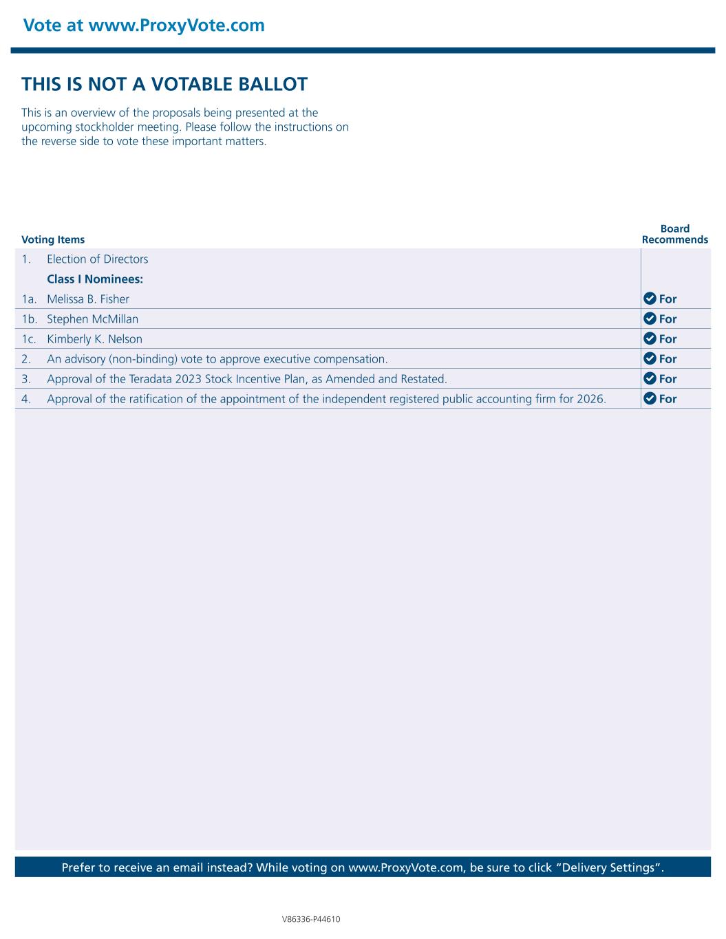 Vote at www.ProxyVote.com Prefer to receive an email instead? While voting on www.ProxyVote.com, be sure to click “Delivery Settings”. Voting Items Board Recommends V86336-P44610 THIS IS NOT A VOTABLE BALLOT This is an overview of the proposals being presented at the upcoming stockholder meeting. Please follow the instructions on the reverse side to vote these important matters. 1. Election of Directors Class I Nominees: 1a. Melissa B. Fisher For 1b. Stephen McMillan For 1c. Kimberly K. Nelson For 2. An advisory (non-binding) vote to approve executive compensation. For 3. Approval of the Teradata 2023 Stock Incentive Plan, as Amended and Restated. For 4. Approval of the ratification of the appointment of the independent registered public accounting firm for 2026. For