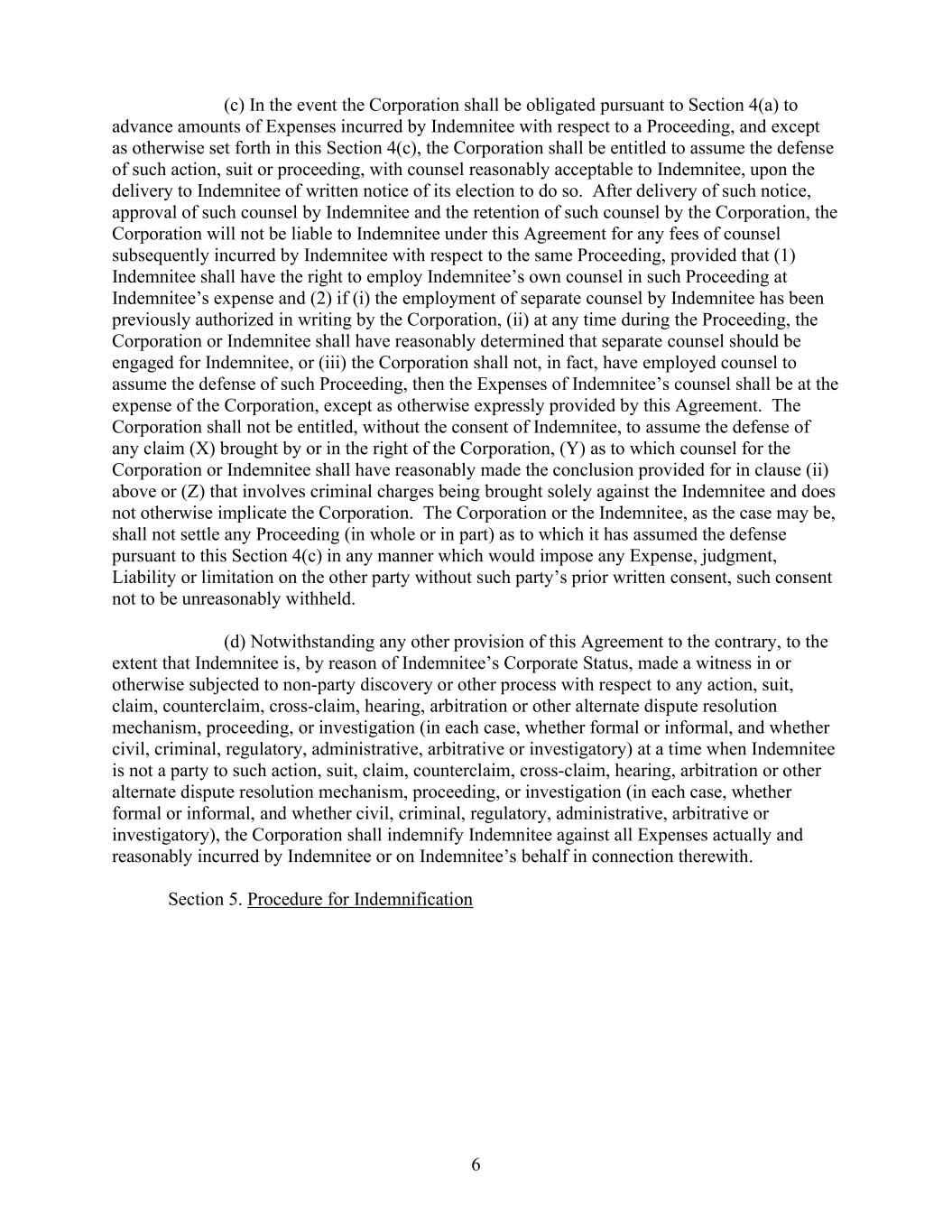 6      (c) In the event the Corporation shall be obligated pursuant to Section 4(a) to  advance amounts of Expenses incurred by Indemnitee with respect to a Proceeding, and except  as otherwise set forth in this Section 4(c), the Corporation shall be entitled to assume the defense  of such action, suit or proceeding, with counsel reasonably acceptable to Indemnitee, upon the  delivery to Indemnitee of written notice of its election to do so.  After delivery of such notice,  approval of such counsel by Indemnitee and the retention of such counsel by the Corporation, the  Corporation will not be liable to Indemnitee under this Agreement for any fees of counsel  subsequently incurred by Indemnitee with respect to the same Proceeding, provided that (1)  Indemnitee shall have the right to employ Indemnitee’s own counsel in such Proceeding at  Indemnitee’s expense and (2) if (i) the employment of separate counsel by Indemnitee has been  previously authorized in writing by the Corporation, (ii) at any time during the Proceeding, the  Corporation or Indemnitee shall have reasonably determined that separate counsel should be  engaged for Indemnitee, or (iii) the Corporation shall not, in fact, have employed counsel to  assume the defense of such Proceeding, then the Expenses of Indemnitee’s counsel shall be at the  expense of the Corporation, except as otherwise expressly provided by this Agreement.  The  Corporation shall not be entitled, without the consent of Indemnitee, to assume the defense of  any claim (X) brought by or in the right of the Corporation, (Y) as to which counsel for the  Corporation or Indemnitee shall have reasonably made the conclusion provided for in clause (ii)  above or (Z) that involves criminal charges being brought solely against the Indemnitee and does  not otherwise implicate the Corporation.  The Corporation or the Indemnitee, as the case may be,  shall not settle any Proceeding (in whole or in part) as to which it has assumed the defense  pursuant to this Section 4(c) in any manner which would impose any Expense, judgment,  Liability or limitation on the other party without such party’s prior written consent, such consent  not to be unreasonably withheld.       (d) Notwithstanding any other provision of this Agreement to the contrary, to the  extent that Indemnitee is, by reason of Indemnitee’s Corporate Status, made a witness in or  otherwise subjected to non-party discovery or other process with respect to any action, suit,  claim, counterclaim, cross-claim, hearing, arbitration or other alternate dispute resolution  mechanism, proceeding, or investigation (in each case, whether formal or informal, and whether  civil, criminal, regulatory, administrative, arbitrative or investigatory) at a time when Indemnitee  is not a party to such action, suit, claim, counterclaim, cross-claim, hearing, arbitration or other  alternate dispute resolution mechanism, proceeding, or investigation (in each case, whether  formal or informal, and whether civil, criminal, regulatory, administrative, arbitrative or  investigatory), the Corporation shall indemnify Indemnitee against all Expenses actually and  reasonably incurred by Indemnitee or on Indemnitee’s behalf in connection therewith.     Section 5. Procedure for Indemnification