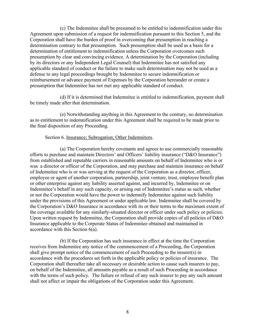8      (c) The Indemnitee shall be presumed to be entitled to indemnification under this  Agreement upon submission of a request for indemnification pursuant to this Section 5, and the  Corporation shall have the burden of proof in overcoming that presumption in reaching a  determination contrary to that presumption.  Such presumption shall be used as a basis for a  determination of entitlement to indemnification unless the Corporation overcomes such  presumption by clear and convincing evidence. A determination by the Corporation (including  by its directors or any Independent Legal Counsel) that Indemnitee has not satisfied any  applicable standard of conduct or the failure to make such determination may not be used as a  defense to any legal proceedings brought by Indemnitee to secure indemnification or  reimbursement or advance payment of Expenses by the Corporation hereunder or create a  presumption that Indemnitee has not met any applicable standard of conduct.      (d) If it is determined that Indemnitee is entitled to indemnification, payment shall  be timely made after that determination.      (e) Notwithstanding anything in this Agreement to the contrary, no determination  as to entitlement to indemnification under this Agreement shall be required to be made prior to  the final disposition of any Proceeding.     Section 6. Insurance; Subrogation; Other Indemnitors.         (a) The Corporation hereby covenants and agrees to use commercially reasonable  efforts to purchase and maintain Directors’ and Officers’ liability insurance (“D&O Insurance”)  from established and reputable carriers in reasonable amounts on behalf of Indemnitee who is or  was  a director or officer of the Corporation, and may purchase and maintain insurance on behalf  of Indemnitee who is or was serving at the request of the Corporation as a director, officer,  employee or agent of another corporation, partnership, joint venture, trust, employee benefit plan  or other enterprise against any liability asserted against, and incurred by, Indemnitee or on  Indemnitee’s behalf in any such capacity, or arising out of Indemnitee’s status as such, whether  or not the Corporation would have the power to indemnify Indemnitee against such liability  under the provisions of this Agreement or under applicable law. Indemnitee shall be covered by  the Corporation’s D&O Insurance in accordance with its or their terms to the maximum extent of  the coverage available for any similarly-situated director or officer under such policy or policies.   Upon written request by Indemnitee, the Corporation shall provide copies of all policies of D&O  Insurance applicable to the Corporate Status of Indemnitee obtained and maintained in  accordance with this Section 6(a).      (b) If the Corporation has such insurance in effect at the time the Corporation  receives from Indemnitee any notice of the commencement of a Proceeding, the Corporation  shall give prompt notice of the commencement of such Proceeding to the insurer(s) in  accordance with the procedures set forth in the applicable policy or policies of insurance.  The  Corporation shall thereafter take all necessary or desirable action to cause such insurers to pay,  on behalf of the Indemnitee, all amounts payable as a result of such Proceeding in accordance  with the terms of such policy.  The failure or refusal of any such insurer to pay any such amount  shall not affect or impair the obligations of the Corporation under this Agreement.