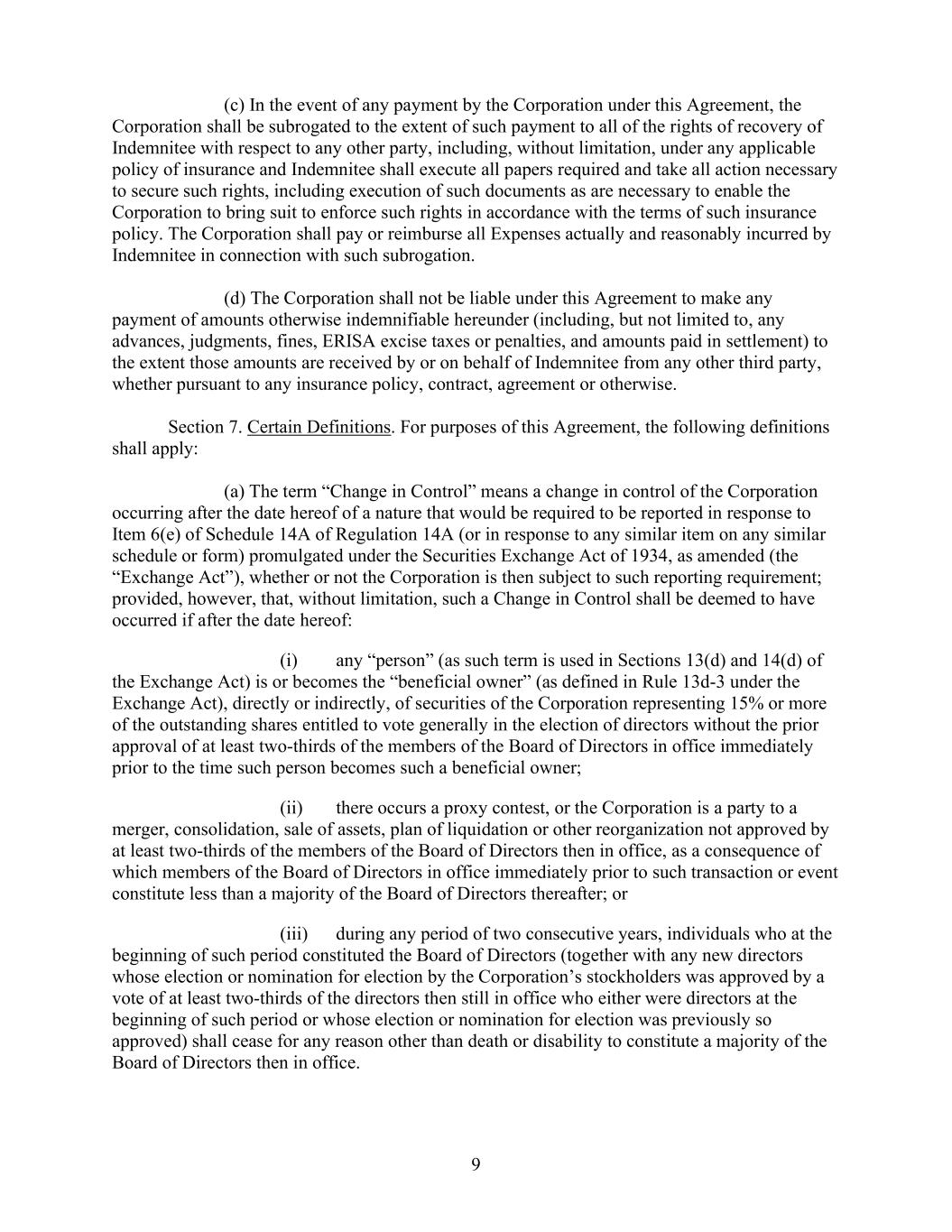 9      (c) In the event of any payment by the Corporation under this Agreement, the  Corporation shall be subrogated to the extent of such payment to all of the rights of recovery of  Indemnitee with respect to any other party, including, without limitation, under any applicable  policy of insurance and Indemnitee shall execute all papers required and take all action necessary  to secure such rights, including execution of such documents as are necessary to enable the  Corporation to bring suit to enforce such rights in accordance with the terms of such insurance  policy. The Corporation shall pay or reimburse all Expenses actually and reasonably incurred by  Indemnitee in connection with such subrogation.      (d) The Corporation shall not be liable under this Agreement to make any  payment of amounts otherwise indemnifiable hereunder (including, but not limited to, any  advances, judgments, fines, ERISA excise taxes or penalties, and amounts paid in settlement) to  the extent those amounts are received by or on behalf of Indemnitee from any other third party,  whether pursuant to any insurance policy, contract, agreement or otherwise.       Section 7. Certain Definitions. For purposes of this Agreement, the following definitions  shall apply:     (a) The term “Change in Control” means a change in control of the Corporation  occurring after the date hereof of a nature that would be required to be reported in response to  Item 6(e) of Schedule 14A of Regulation 14A (or in response to any similar item on any similar  schedule or form) promulgated under the Securities Exchange Act of 1934, as amended (the  “Exchange Act”), whether or not the Corporation is then subject to such reporting requirement;  provided, however, that, without limitation, such a Change in Control shall be deemed to have  occurred if after the date hereof:  (i) any “person” (as such term is used in Sections 13(d) and 14(d) of  the Exchange Act) is or becomes the “beneficial owner” (as defined in Rule 13d-3 under the  Exchange Act), directly or indirectly, of securities of the Corporation representing 15% or more  of the outstanding shares entitled to vote generally in the election of directors without the prior  approval of at least two-thirds of the members of the Board of Directors in office immediately  prior to the time such person becomes such a beneficial owner;   (ii) there occurs a proxy contest, or the Corporation is a party to a  merger, consolidation, sale of assets, plan of liquidation or other reorganization not approved by  at least two-thirds of the members of the Board of Directors then in office, as a consequence of  which members of the Board of Directors in office immediately prior to such transaction or event  constitute less than a majority of the Board of Directors thereafter; or  (iii) during any period of two consecutive years, individuals who at the  beginning of such period constituted the Board of Directors (together with any new directors  whose election or nomination for election by the Corporation’s stockholders was approved by a  vote of at least two-thirds of the directors then still in office who either were directors at the  beginning of such period or whose election or nomination for election was previously so  approved) shall cease for any reason other than death or disability to constitute a majority of the  Board of Directors then in office.
