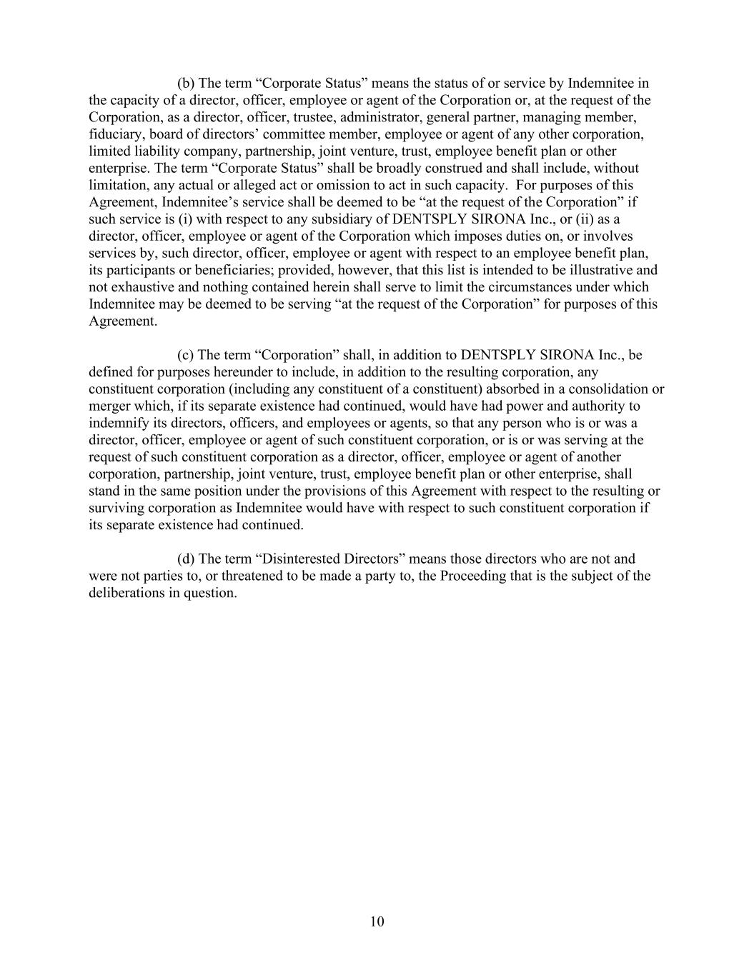 10    (b) The term “Corporate Status” means the status of or service by Indemnitee in  the capacity of a director, officer, employee or agent of the Corporation or, at the request of the  Corporation, as a director, officer, trustee, administrator, general partner, managing member,  fiduciary, board of directors’ committee member, employee or agent of any other corporation,  limited liability company, partnership, joint venture, trust, employee benefit plan or other  enterprise. The term “Corporate Status” shall be broadly construed and shall include, without  limitation, any actual or alleged act or omission to act in such capacity.  For purposes of this  Agreement, Indemnitee’s service shall be deemed to be “at the request of the Corporation” if  such service is (i) with respect to any subsidiary of DENTSPLY SIRONA Inc., or (ii) as a  director, officer, employee or agent of the Corporation which imposes duties on, or involves  services by, such director, officer, employee or agent with respect to an employee benefit plan,  its participants or beneficiaries; provided, however, that this list is intended to be illustrative and  not exhaustive and nothing contained herein shall serve to limit the circumstances under which  Indemnitee may be deemed to be serving “at the request of the Corporation” for purposes of this  Agreement.      (c) The term “Corporation” shall, in addition to DENTSPLY SIRONA Inc., be  defined for purposes hereunder to include, in addition to the resulting corporation, any  constituent corporation (including any constituent of a constituent) absorbed in a consolidation or  merger which, if its separate existence had continued, would have had power and authority to  indemnify its directors, officers, and employees or agents, so that any person who is or was a  director, officer, employee or agent of such constituent corporation, or is or was serving at the  request of such constituent corporation as a director, officer, employee or agent of another  corporation, partnership, joint venture, trust, employee benefit plan or other enterprise, shall  stand in the same position under the provisions of this Agreement with respect to the resulting or  surviving corporation as Indemnitee would have with respect to such constituent corporation if  its separate existence had continued.       (d) The term “Disinterested Directors” means those directors who are not and  were not parties to, or threatened to be made a party to, the Proceeding that is the subject of the  deliberations in question.