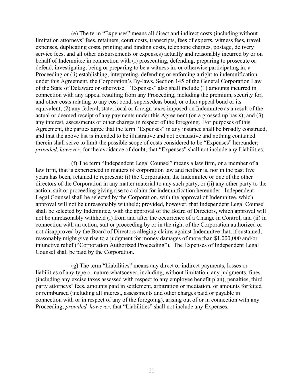 11      (e) The term “Expenses” means all direct and indirect costs (including without  limitation attorneys’ fees, retainers, court costs, transcripts, fees of experts, witness fees, travel  expenses, duplicating costs, printing and binding costs, telephone charges, postage, delivery  service fees, and all other disbursements or expenses) actually and reasonably incurred by or on  behalf of Indemnitee in connection with (i) prosecuting, defending, preparing to prosecute or  defend, investigating, being or preparing to be a witness in, or otherwise participating in, a  Proceeding or (ii) establishing, interpreting, defending or enforcing a right to indemnification  under this Agreement, the Corporation’s By-laws, Section 145 of the General Corporation Law  of the State of Delaware or otherwise.  “Expenses” also shall include (1) amounts incurred in  connection with any appeal resulting from any Proceeding, including the premium, security for,  and other costs relating to any cost bond, supersedeas bond, or other appeal bond or its  equivalent; (2) any federal, state, local or foreign taxes imposed on Indemnitee as a result of the  actual or deemed receipt of any payments under this Agreement (on a grossed up basis); and (3)  any interest, assessments or other charges in respect of the foregoing.  For purposes of this  Agreement, the parties agree that the term “Expenses” in any instance shall be broadly construed,  and that the above list is intended to be illustrative and not exhaustive and nothing contained  therein shall serve to limit the possible scope of costs considered to be “Expenses” hereunder;  provided, however, for the avoidance of doubt, that “Expenses” shall not include any Liabilities.      (f) The term “Independent Legal Counsel” means a law firm, or a member of a  law firm, that is experienced in matters of corporation law and neither is, nor in the past five  years has been, retained to represent: (i) the Corporation, the Indemnitee or one of the other  directors of the Corporation in any matter material to any such party, or (ii) any other party to the  action, suit or proceeding giving rise to a claim for indemnification hereunder.  Independent  Legal Counsel shall be selected by the Corporation, with the approval of Indemnitee, which  approval will not be unreasonably withheld; provided, however, that Independent Legal Counsel  shall be selected by Indemnitee, with the approval of the Board of Directors, which approval will  not be unreasonably withheld (i) from and after the occurrence of a Change in Control, and (ii) in  connection with an action, suit or proceeding by or in the right of the Corporation authorized or  not disapproved by the Board of Directors alleging claims against Indemnitee that, if sustained,  reasonably might give rise to a judgment for money damages of more than $1,000,000 and/or  injunctive relief (“Corporation Authorized Proceeding”).  The Expenses of Independent Legal  Counsel shall be paid by the Corporation.      (g) The term “Liabilities” means any direct or indirect payments, losses or  liabilities of any type or nature whatsoever, including, without limitation, any judgments, fines  (including any excise taxes assessed with respect to any employee benefit plan), penalties, third  party attorneys’ fees, amounts paid in settlement, arbitration or mediation, or amounts forfeited  or reimbursed (including all interest, assessments and other charges paid or payable in  connection with or in respect of any of the foregoing), arising out of or in connection with any  Proceeding; provided, however, that “Liabilities” shall not include any Expenses.