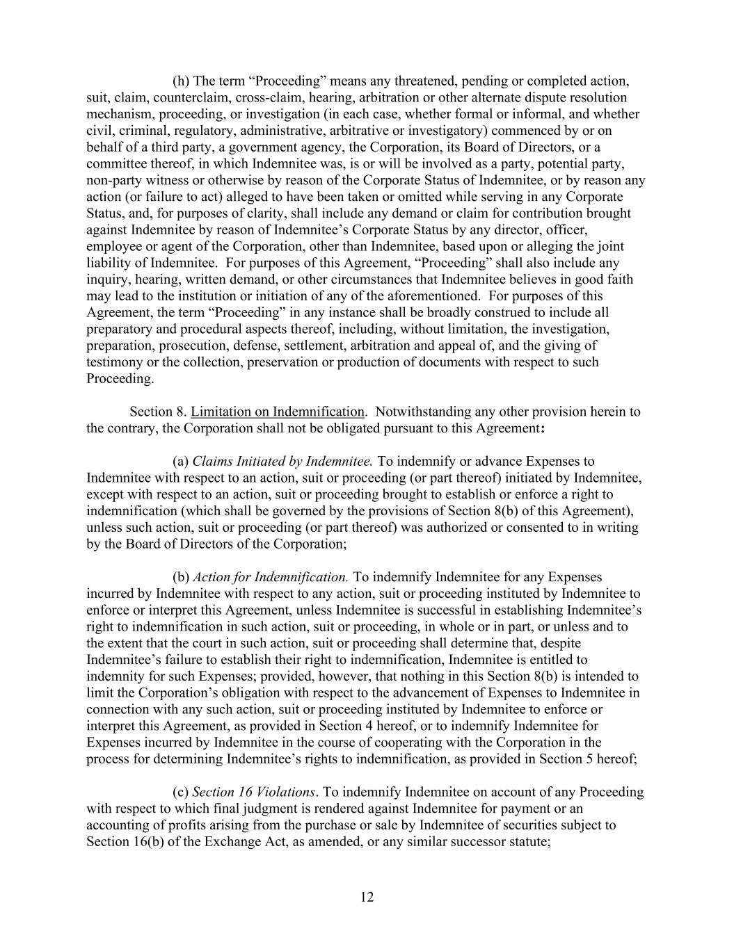 12      (h) The term “Proceeding” means any threatened, pending or completed action,  suit, claim, counterclaim, cross-claim, hearing, arbitration or other alternate dispute resolution  mechanism, proceeding, or investigation (in each case, whether formal or informal, and whether  civil, criminal, regulatory, administrative, arbitrative or investigatory) commenced by or on  behalf of a third party, a government agency, the Corporation, its Board of Directors, or a  committee thereof, in which Indemnitee was, is or will be involved as a party, potential party,  non-party witness or otherwise by reason of the Corporate Status of Indemnitee, or by reason any  action (or failure to act) alleged to have been taken or omitted while serving in any Corporate  Status, and, for purposes of clarity, shall include any demand or claim for contribution brought  against Indemnitee by reason of Indemnitee’s Corporate Status by any director, officer,  employee or agent of the Corporation, other than Indemnitee, based upon or alleging the joint  liability of Indemnitee.  For purposes of this Agreement, “Proceeding” shall also include any  inquiry, hearing, written demand, or other circumstances that Indemnitee believes in good faith  may lead to the institution or initiation of any of the aforementioned.  For purposes of this  Agreement, the term “Proceeding” in any instance shall be broadly construed to include all  preparatory and procedural aspects thereof, including, without limitation, the investigation,  preparation, prosecution, defense, settlement, arbitration and appeal of, and the giving of  testimony or the collection, preservation or production of documents with respect to such  Proceeding.     Section 8. Limitation on Indemnification.  Notwithstanding any other provision herein to  the contrary, the Corporation shall not be obligated pursuant to this Agreement:      (a) Claims Initiated by Indemnitee. To indemnify or advance Expenses to  Indemnitee with respect to an action, suit or proceeding (or part thereof) initiated by Indemnitee,  except with respect to an action, suit or proceeding brought to establish or enforce a right to  indemnification (which shall be governed by the provisions of Section 8(b) of this Agreement),  unless such action, suit or proceeding (or part thereof) was authorized or consented to in writing  by the Board of Directors of the Corporation;      (b) Action for Indemnification. To indemnify Indemnitee for any Expenses  incurred by Indemnitee with respect to any action, suit or proceeding instituted by Indemnitee to  enforce or interpret this Agreement, unless Indemnitee is successful in establishing Indemnitee’s  right to indemnification in such action, suit or proceeding, in whole or in part, or unless and to  the extent that the court in such action, suit or proceeding shall determine that, despite  Indemnitee’s failure to establish their right to indemnification, Indemnitee is entitled to  indemnity for such Expenses; provided, however, that nothing in this Section 8(b) is intended to  limit the Corporation’s obligation with respect to the advancement of Expenses to Indemnitee in  connection with any such action, suit or proceeding instituted by Indemnitee to enforce or  interpret this Agreement, as provided in Section 4 hereof, or to indemnify Indemnitee for  Expenses incurred by Indemnitee in the course of cooperating with the Corporation in the  process for determining Indemnitee’s rights to indemnification, as provided in Section 5 hereof;      (c) Section 16 Violations. To indemnify Indemnitee on account of any Proceeding  with respect to which final judgment is rendered against Indemnitee for payment or an  accounting of profits arising from the purchase or sale by Indemnitee of securities subject to  Section 16(b) of the Exchange Act, as amended, or any similar successor statute;