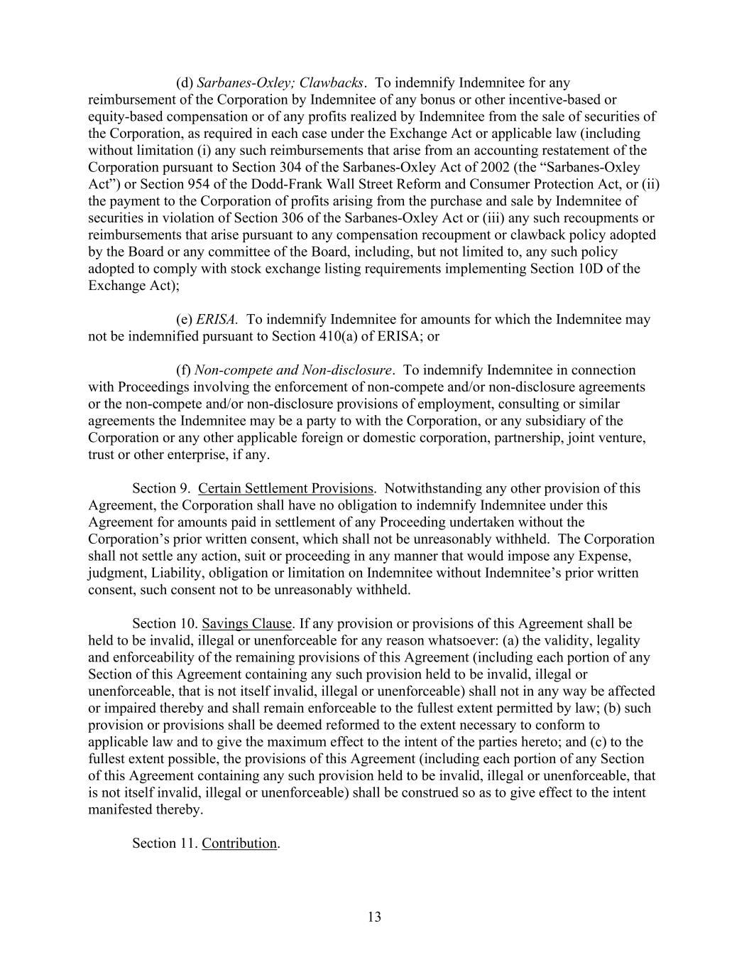 13      (d) Sarbanes-Oxley; Clawbacks.  To indemnify Indemnitee for any  reimbursement of the Corporation by Indemnitee of any bonus or other incentive-based or  equity-based compensation or of any profits realized by Indemnitee from the sale of securities of  the Corporation, as required in each case under the Exchange Act or applicable law (including  without limitation (i) any such reimbursements that arise from an accounting restatement of the  Corporation pursuant to Section 304 of the Sarbanes-Oxley Act of 2002 (the “Sarbanes-Oxley  Act”) or Section 954 of the Dodd-Frank Wall Street Reform and Consumer Protection Act, or (ii)  the payment to the Corporation of profits arising from the purchase and sale by Indemnitee of  securities in violation of Section 306 of the Sarbanes-Oxley Act or (iii) any such recoupments or  reimbursements that arise pursuant to any compensation recoupment or clawback policy adopted  by the Board or any committee of the Board, including, but not limited to, any such policy  adopted to comply with stock exchange listing requirements implementing Section 10D of the  Exchange Act);       (e) ERISA.  To indemnify Indemnitee for amounts for which the Indemnitee may  not be indemnified pursuant to Section 410(a) of ERISA; or      (f) Non-compete and Non-disclosure.  To indemnify Indemnitee in connection  with Proceedings involving the enforcement of non-compete and/or non-disclosure agreements  or the non-compete and/or non-disclosure provisions of employment, consulting or similar  agreements the Indemnitee may be a party to with the Corporation, or any subsidiary of the  Corporation or any other applicable foreign or domestic corporation, partnership, joint venture,  trust or other enterprise, if any.     Section 9.  Certain Settlement Provisions.  Notwithstanding any other provision of this  Agreement, the Corporation shall have no obligation to indemnify Indemnitee under this  Agreement for amounts paid in settlement of any Proceeding undertaken without the  Corporation’s prior written consent, which shall not be unreasonably withheld.  The Corporation  shall not settle any action, suit or proceeding in any manner that would impose any Expense,  judgment, Liability, obligation or limitation on Indemnitee without Indemnitee’s prior written  consent, such consent not to be unreasonably withheld.       Section 10. Savings Clause. If any provision or provisions of this Agreement shall be  held to be invalid, illegal or unenforceable for any reason whatsoever: (a) the validity, legality  and enforceability of the remaining provisions of this Agreement (including each portion of any  Section of this Agreement containing any such provision held to be invalid, illegal or  unenforceable, that is not itself invalid, illegal or unenforceable) shall not in any way be affected  or impaired thereby and shall remain enforceable to the fullest extent permitted by law; (b) such  provision or provisions shall be deemed reformed to the extent necessary to conform to  applicable law and to give the maximum effect to the intent of the parties hereto; and (c) to the  fullest extent possible, the provisions of this Agreement (including each portion of any Section  of this Agreement containing any such provision held to be invalid, illegal or unenforceable, that  is not itself invalid, illegal or unenforceable) shall be construed so as to give effect to the intent  manifested thereby.     Section 11. Contribution.