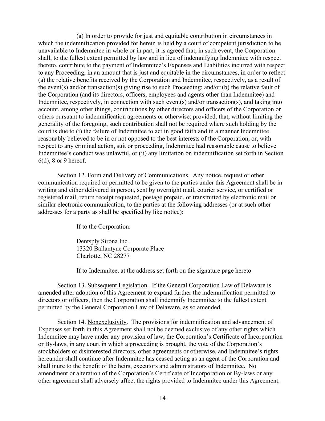 14      (a) In order to provide for just and equitable contribution in circumstances in  which the indemnification provided for herein is held by a court of competent jurisdiction to be  unavailable to Indemnitee in whole or in part, it is agreed that, in such event, the Corporation  shall, to the fullest extent permitted by law and in lieu of indemnifying Indemnitee with respect  thereto, contribute to the payment of Indemnitee’s Expenses and Liabilities incurred with respect  to any Proceeding, in an amount that is just and equitable in the circumstances, in order to reflect  (a) the relative benefits received by the Corporation and Indemnitee, respectively, as a result of  the event(s) and/or transaction(s) giving rise to such Proceeding; and/or (b) the relative fault of  the Corporation (and its directors, officers, employees and agents other than Indemnitee) and  Indemnitee, respectively, in connection with such event(s) and/or transaction(s), and taking into  account, among other things, contributions by other directors and officers of the Corporation or  others pursuant to indemnification agreements or otherwise; provided, that, without limiting the  generality of the foregoing, such contribution shall not be required where such holding by the  court is due to (i) the failure of Indemnitee to act in good faith and in a manner Indemnitee  reasonably believed to be in or not opposed to the best interests of the Corporation, or, with  respect to any criminal action, suit or proceeding, Indemnitee had reasonable cause to believe  Indemnitee’s conduct was unlawful, or (ii) any limitation on indemnification set forth in Section  6(d), 8 or 9 hereof.       Section 12. Form and Delivery of Communications.  Any notice, request or other  communication required or permitted to be given to the parties under this Agreement shall be in  writing and either delivered in person, sent by overnight mail, courier service, or certified or  registered mail, return receipt requested, postage prepaid, or transmitted by electronic mail or  similar electronic communication, to the parties at the following addresses (or at such other  addresses for a party as shall be specified by like notice):      If to the Corporation:         Dentsply Sirona Inc.    13320 Ballantyne Corporate Place    Charlotte, NC 28277      If to Indemnitee, at the address set forth on the signature page hereto.      Section 13. Subsequent Legislation.  If the General Corporation Law of Delaware is  amended after adoption of this Agreement to expand further the indemnification permitted to  directors or officers, then the Corporation shall indemnify Indemnitee to the fullest extent  permitted by the General Corporation Law of Delaware, as so amended.     Section 14. Nonexclusivity.  The provisions for indemnification and advancement of  Expenses set forth in this Agreement shall not be deemed exclusive of any other rights which  Indemnitee may have under any provision of law, the Corporation’s Certificate of Incorporation  or By-laws, in any court in which a proceeding is brought, the vote of the Corporation’s  stockholders or disinterested directors, other agreements or otherwise, and Indemnitee’s rights  hereunder shall continue after Indemnitee has ceased acting as an agent of the Corporation and  shall inure to the benefit of the heirs, executors and administrators of Indemnitee.  No  amendment or alteration of the Corporation’s Certificate of Incorporation or By-laws or any  other agreement shall adversely affect the rights provided to Indemnitee under this Agreement.