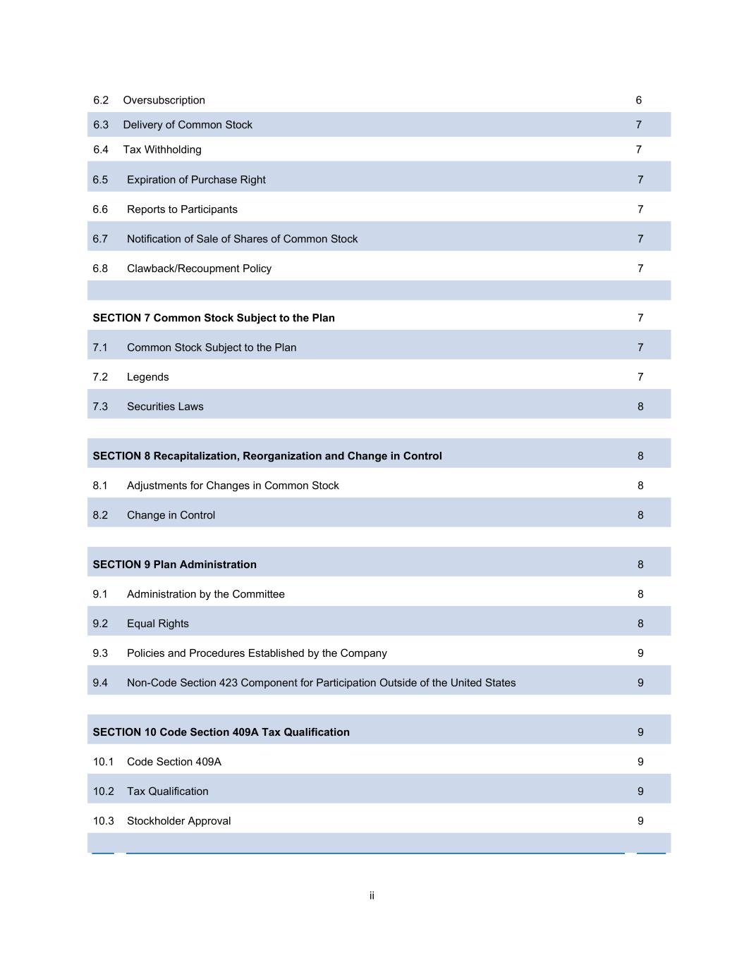 ii     6.2   Oversubscription    6    6.3   Delivery of Common Stock    7    6.4   Tax Withholding    7    6.5   Expiration of Purchase Right    7    6.6   Reports to Participants    7    6.7   Notification of Sale of Shares of Common Stock    7    6.8   Clawback/Recoupment Policy    7                SECTION 7 Common Stock Subject to the Plan    7    7.1   Common Stock Subject to the Plan    7    7.2   Legends    7    7.3   Securities Laws    8                SECTION 8 Recapitalization, Reorganization and Change in Control    8    8.1   Adjustments for Changes in Common Stock    8    8.2   Change in Control    8                SECTION 9 Plan Administration    8    9.1   Administration by the Committee    8    9.2   Equal Rights    8    9.3   Policies and Procedures Established by the Company    9    9.4   Non-Code Section 423 Component for Participation Outside of the United States    9                SECTION 10 Code Section 409A Tax Qualification    9    10.1   Code Section 409A    9    10.2   Tax Qualification    9    10.3   Stockholder Approval    9