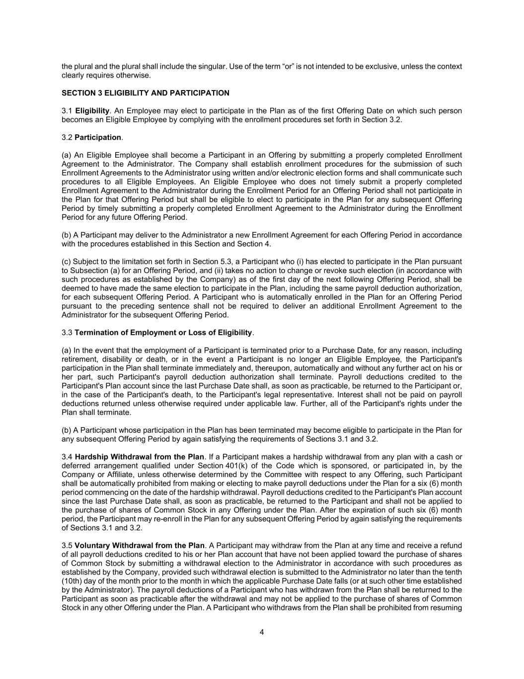 4    the plural and the plural shall include the singular. Use of the term “or” is not intended to be exclusive, unless the context  clearly requires otherwise.     SECTION 3 ELIGIBILITY AND PARTICIPATION     3.1 Eligibility. An Employee may elect to participate in the Plan as of the first Offering Date on which such person  becomes an Eligible Employee by complying with the enrollment procedures set forth in Section 3.2.     3.2 Participation.     (a) An Eligible Employee shall become a Participant in an Offering by submitting a properly completed Enrollment  Agreement to the Administrator. The Company shall establish enrollment procedures for the submission of such  Enrollment Agreements to the Administrator using written and/or electronic election forms and shall communicate such  procedures to all Eligible Employees. An Eligible Employee who does not timely submit a properly completed  Enrollment Agreement to the Administrator during the Enrollment Period for an Offering Period shall not participate in  the Plan for that Offering Period but shall be eligible to elect to participate in the Plan for any subsequent Offering  Period by timely submitting a properly completed Enrollment Agreement to the Administrator during the Enrollment  Period for any future Offering Period.     (b) A Participant may deliver to the Administrator a new Enrollment Agreement for each Offering Period in accordance  with the procedures established in this Section and Section 4.     (c) Subject to the limitation set forth in Section 5.3, a Participant who (i) has elected to participate in the Plan pursuant  to Subsection (a) for an Offering Period, and (ii) takes no action to change or revoke such election (in accordance with  such procedures as established by the Company) as of the first day of the next following Offering Period, shall be  deemed to have made the same election to participate in the Plan, including the same payroll deduction authorization,  for each subsequent Offering Period. A Participant who is automatically enrolled in the Plan for an Offering Period  pursuant to the preceding sentence shall not be required to deliver an additional Enrollment Agreement to the  Administrator for the subsequent Offering Period.     3.3 Termination of Employment or Loss of Eligibility.     (a) In the event that the employment of a Participant is terminated prior to a Purchase Date, for any reason, including  retirement, disability or death, or in the event a Participant is no longer an Eligible Employee, the Participant's  participation in the Plan shall terminate immediately and, thereupon, automatically and without any further act on his or  her part, such Participant's payroll deduction authorization shall terminate. Payroll deductions credited to the  Participant's Plan account since the last Purchase Date shall, as soon as practicable, be returned to the Participant or,  in the case of the Participant's death, to the Participant's legal representative. Interest shall not be paid on payroll  deductions returned unless otherwise required under applicable law. Further, all of the Participant's rights under the  Plan shall terminate.     (b) A Participant whose participation in the Plan has been terminated may become eligible to participate in the Plan for  any subsequent Offering Period by again satisfying the requirements of Sections 3.1 and 3.2.     3.4 Hardship Withdrawal from the Plan. If a Participant makes a hardship withdrawal from any plan with a cash or  deferred arrangement qualified under Section 401(k) of the Code which is sponsored, or participated in, by the  Company or Affiliate, unless otherwise determined by the Committee with respect to any Offering, such Participant  shall be automatically prohibited from making or electing to make payroll deductions under the Plan for a six (6) month  period commencing on the date of the hardship withdrawal. Payroll deductions credited to the Participant's Plan account  since the last Purchase Date shall, as soon as practicable, be returned to the Participant and shall not be applied to  the purchase of shares of Common Stock in any Offering under the Plan. After the expiration of such six (6) month  period, the Participant may re-enroll in the Plan for any subsequent Offering Period by again satisfying the requirements  of Sections 3.1 and 3.2.     3.5 Voluntary Withdrawal from the Plan. A Participant may withdraw from the Plan at any time and receive a refund  of all payroll deductions credited to his or her Plan account that have not been applied toward the purchase of shares  of Common Stock by submitting a withdrawal election to the Administrator in accordance with such procedures as  established by the Company, provided such withdrawal election is submitted to the Administrator no later than the tenth  (10th) day of the month prior to the month in which the applicable Purchase Date falls (or at such other time established  by the Administrator). The payroll deductions of a Participant who has withdrawn from the Plan shall be returned to the  Participant as soon as practicable after the withdrawal and may not be applied to the purchase of shares of Common  Stock in any other Offering under the Plan. A Participant who withdraws from the Plan shall be prohibited from resuming