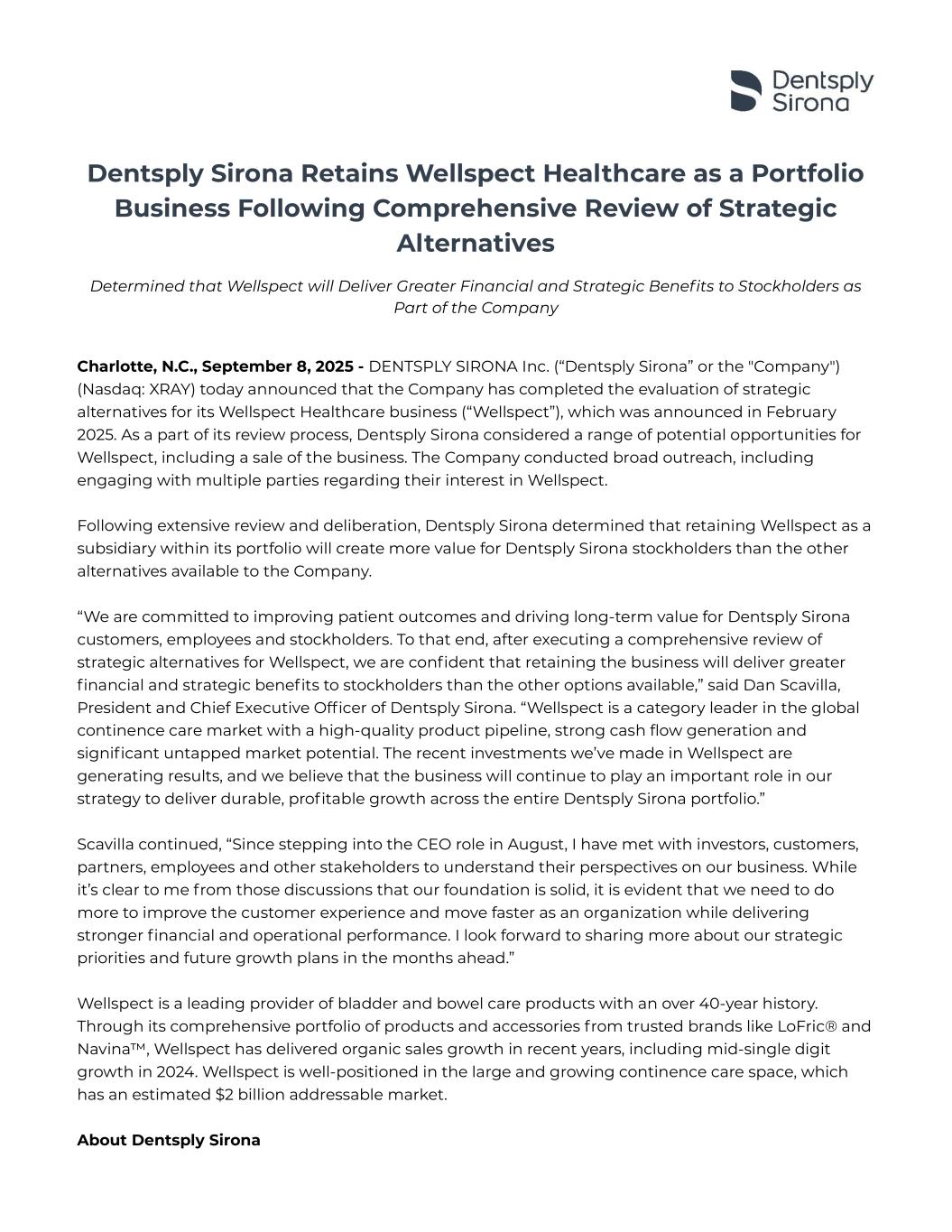 Dentsply Sirona Retains Wellspect Healthcare as a Portfolio  Business Following Comprehensive Review of Strategic  Alternatives  Determined that Wellspect will Deliver Greater Financial and Strategic Benefits to Stockholders as  Part of the Company    Charlotte, N.C., September 8, 2025 - DENTSPLY SIRONA Inc. (“Dentsply Sirona” or the "Company")  (Nasdaq: XRAY) today announced that the Company has completed the evaluation of strategic  alternatives for its Wellspect Healthcare business (“Wellspect”), which was announced in February  2025. As a part of its review process, Dentsply Sirona considered a range of potential opportunities for  Wellspect, including a sale of the business. The Company conducted broad outreach, including  engaging with multiple parties regarding their interest in Wellspect.    Following extensive review and deliberation, Dentsply Sirona determined that retaining Wellspect as a  subsidiary within its portfolio will create more value for Dentsply Sirona stockholders than the other  alternatives available to the Company.     “We are committed to improving patient outcomes and driving long-term value for Dentsply Sirona  customers, employees and stockholders. To that end, after executing a comprehensive review of  strategic alternatives for Wellspect, we are confident that retaining the business will deliver greater  financial and strategic benefits to stockholders than the other options available,” said Dan Scavilla,  President and Chief Executive Officer of Dentsply Sirona. “Wellspect is a category leader in the global  continence care market with a high-quality product pipeline, strong cash flow generation and  significant untapped market potential. The recent investments we’ve made in Wellspect are  generating results, and we believe that the business will continue to play an important role in our  strategy to deliver durable, profitable growth across the entire Dentsply Sirona portfolio.”     Scavilla continued, “Since stepping into the CEO role in August, I have met with investors, customers,  partners, employees and other stakeholders to understand their perspectives on our business. While  it’s clear to me from those discussions that our foundation is solid, it is evident that we need to do  more to improve the customer experience and move faster as an organization while delivering  stronger financial and operational performance. I look forward to sharing more about our strategic  priorities and future growth plans in the months ahead.”     Wellspect is a leading provider of bladder and bowel care products with an over 40-year history.  Through its comprehensive portfolio of products and accessories from trusted brands like LoFric® and  Navina™, Wellspect has delivered organic sales growth in recent years, including mid-single digit  growth in 2024. Wellspect is well-positioned in the large and growing continence care space, which  has an estimated $2 billion addressable market.     About Dentsply Sirona