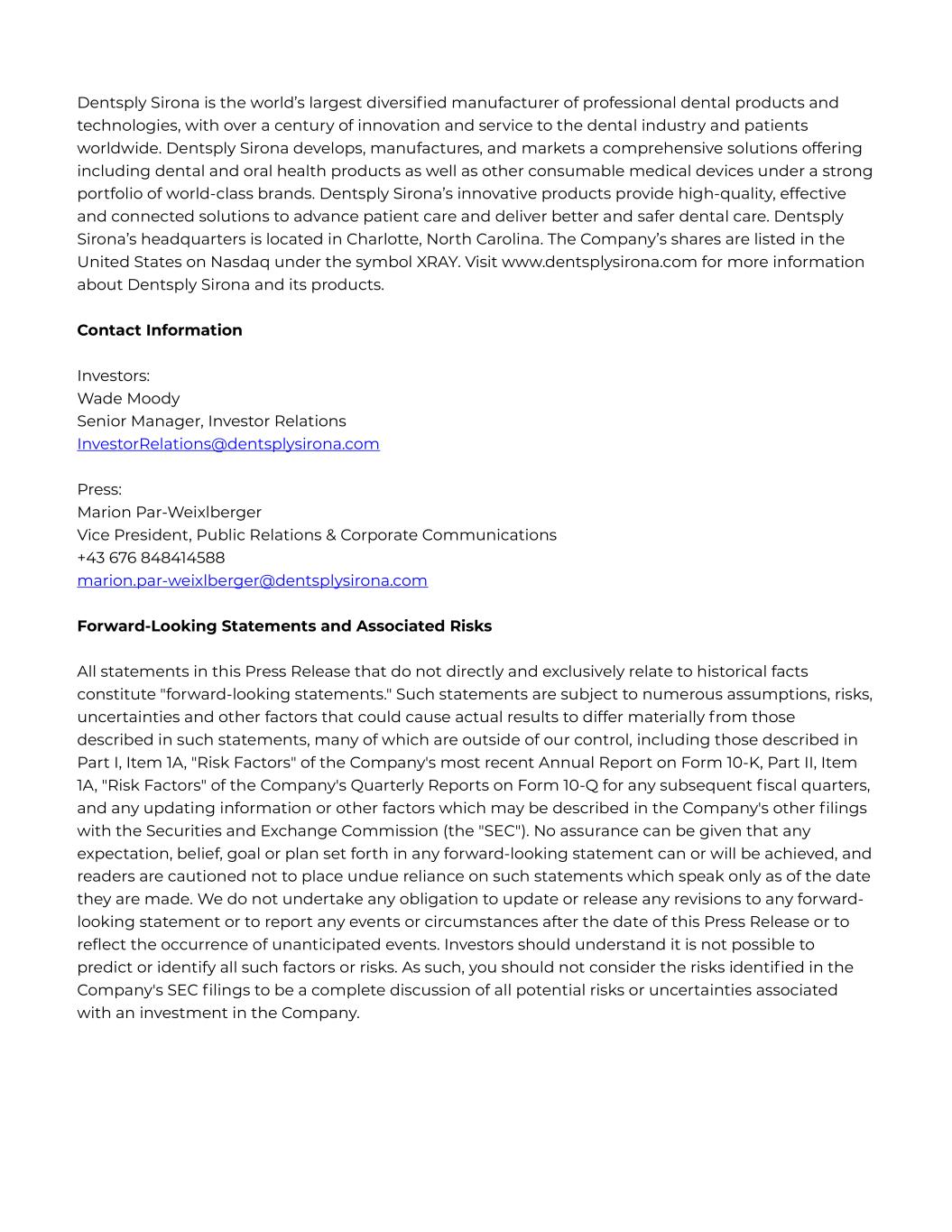Dentsply Sirona is the world’s largest diversified manufacturer of professional dental products and  technologies, with over a century of innovation and service to the dental industry and patients  worldwide. Dentsply Sirona develops, manufactures, and markets a comprehensive solutions offering  including dental and oral health products as well as other consumable medical devices under a strong  portfolio of world-class brands. Dentsply Sirona’s innovative products provide high-quality, effective  and connected solutions to advance patient care and deliver better and safer dental care. Dentsply  Sirona’s headquarters is located in Charlotte, North Carolina. The Company’s shares are listed in the  United States on Nasdaq under the symbol XRAY. Visit www.dentsplysirona.com for more information  about Dentsply Sirona and its products.    Contact Information    Investors:  Wade Moody  Senior Manager, Investor Relations  InvestorRelations@dentsplysirona.com    Press:  Marion Par-Weixlberger  Vice President, Public Relations & Corporate Communications  +43 676 848414588  marion.par-weixlberger@dentsplysirona.com    Forward-Looking Statements and Associated Risks    All statements in this Press Release that do not directly and exclusively relate to historical facts  constitute "forward-looking statements." Such statements are subject to numerous assumptions, risks,  uncertainties and other factors that could cause actual results to differ materially from those  described in such statements, many of which are outside of our control, including those described in  Part I, Item 1A, "Risk Factors" of the Company's most recent Annual Report on Form 10-K, Part II, Item  1A, "Risk Factors" of the Company's Quarterly Reports on Form 10-Q for any subsequent fiscal quarters,  and any updating information or other factors which may be described in the Company's other filings  with the Securities and Exchange Commission (the "SEC"). No assurance can be given that any  expectation, belief, goal or plan set forth in any forward-looking statement can or will be achieved, and  readers are cautioned not to place undue reliance on such statements which speak only as of the date  they are made. We do not undertake any obligation to update or release any revisions to any forward- looking statement or to report any events or circumstances after the date of this Press Release or to  reflect the occurrence of unanticipated events. Investors should understand it is not possible to  predict or identify all such factors or risks. As such, you should not consider the risks identified in the  Company's SEC filings to be a complete discussion of all potential risks or uncertainties associated  with an investment in the Company.