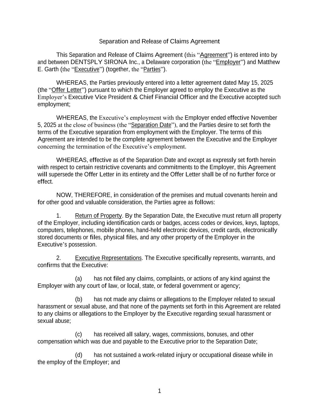 1 Separation and Release of Claims Agreement This Separation and Release of Claims Agreement (this “Agreement”) is entered into by and between DENTSPLY SIRONA Inc., a Delaware corporation (the “Employer”) and Matthew E. Garth (the “Executive”) (together, the “Parties”). WHEREAS, the Parties previously entered into a letter agreement dated May 15, 2025 (the “Offer Letter”) pursuant to which the Employer agreed to employ the Executive as the Employer’s Executive Vice President & Chief Financial Officer and the Executive accepted such employment; WHEREAS, the Executive’s employment with the Employer ended effective November 5, 2025 at the close of business (the “Separation Date”), and the Parties desire to set forth the terms of the Executive separation from employment with the Employer. The terms of this Agreement are intended to be the complete agreement between the Executive and the Employer concerning the termination of the Executive’s employment. WHEREAS, effective as of the Separation Date and except as expressly set forth herein with respect to certain restrictive covenants and commitments to the Employer, this Agreement will supersede the Offer Letter in its entirety and the Offer Letter shall be of no further force or effect. NOW, THEREFORE, in consideration of the premises and mutual covenants herein and for other good and valuable consideration, the Parties agree as follows: 1. Return of Property. By the Separation Date, the Executive must return all property of the Employer, including identification cards or badges, access codes or devices, keys, laptops, computers, telephones, mobile phones, hand-held electronic devices, credit cards, electronically stored documents or files, physical files, and any other property of the Employer in the Executive’s possession. 2. Executive Representations. The Executive specifically represents, warrants, and confirms that the Executive: (a) has not filed any claims, complaints, or actions of any kind against the Employer with any court of law, or local, state, or federal government or agency; (b) has not made any claims or allegations to the Employer related to sexual harassment or sexual abuse, and that none of the payments set forth in this Agreement are related to any claims or allegations to the Employer by the Executive regarding sexual harassment or sexual abuse; (c) has received all salary, wages, commissions, bonuses, and other compensation which was due and payable to the Executive prior to the Separation Date; (d) has not sustained a work-related injury or occupational disease while in the employ of the Employer; and