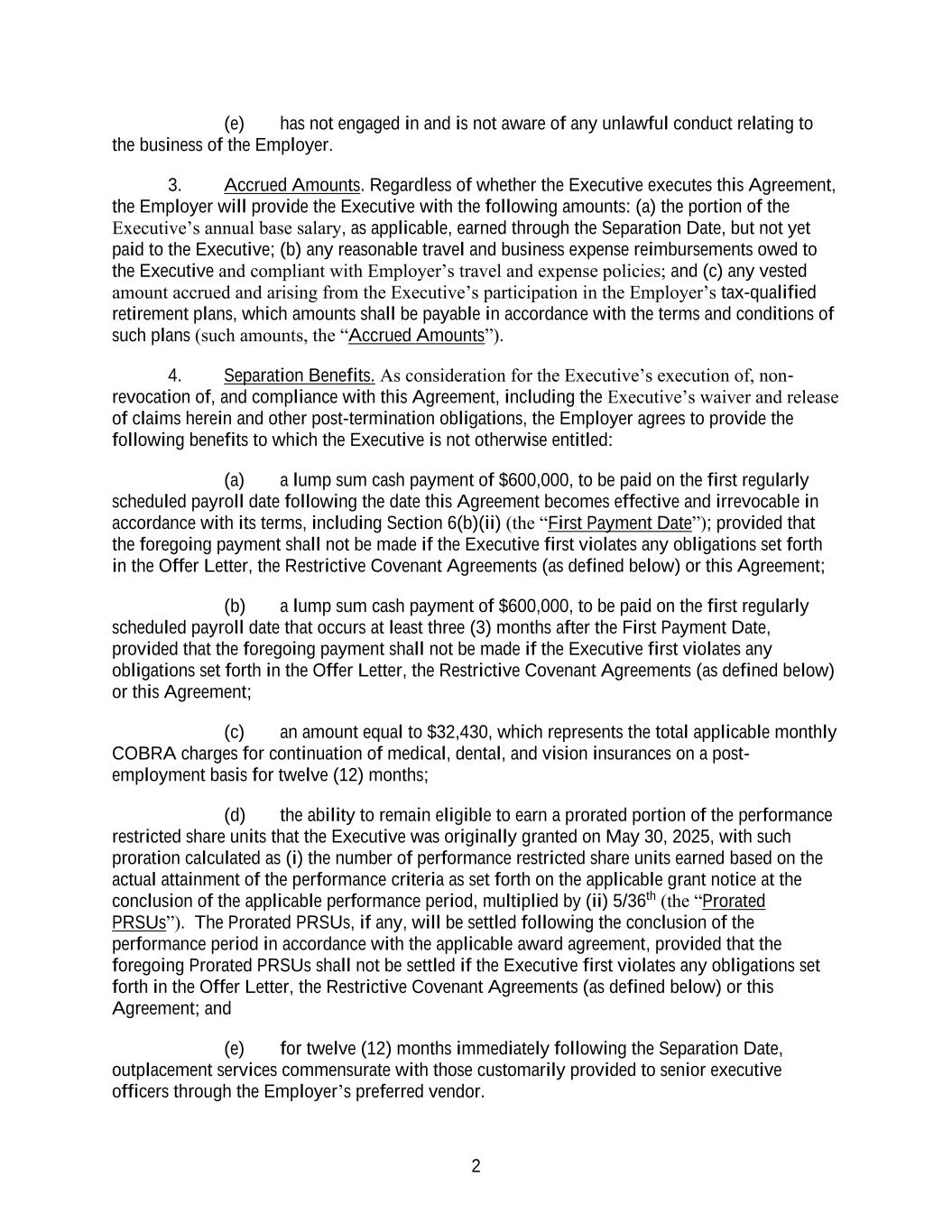 2 (e) has not engaged in and is not aware of any unlawful conduct relating to the business of the Employer. 3. Accrued Amounts. Regardless of whether the Executive executes this Agreement, the Employer will provide the Executive with the following amounts: (a) the portion of the Executive’s annual base salary, as applicable, earned through the Separation Date, but not yet paid to the Executive; (b) any reasonable travel and business expense reimbursements owed to the Executive and compliant with Employer’s travel and expense policies; and (c) any vested amount accrued and arising from the Executive’s participation in the Employer’s tax-qualified retirement plans, which amounts shall be payable in accordance with the terms and conditions of such plans (such amounts, the “Accrued Amounts”). 4. Separation Benefits. As consideration for the Executive’s execution of, non- revocation of, and compliance with this Agreement, including the Executive’s waiver and release of claims herein and other post-termination obligations, the Employer agrees to provide the following benefits to which the Executive is not otherwise entitled: (a) a lump sum cash payment of $600,000, to be paid on the first regularly scheduled payroll date following the date this Agreement becomes effective and irrevocable in accordance with its terms, including Section 6(b)(ii) (the “First Payment Date”); provided that the foregoing payment shall not be made if the Executive first violates any obligations set forth in the Offer Letter, the Restrictive Covenant Agreements (as defined below) or this Agreement; (b) a lump sum cash payment of $600,000, to be paid on the first regularly scheduled payroll date that occurs at least three (3) months after the First Payment Date, provided that the foregoing payment shall not be made if the Executive first violates any obligations set forth in the Offer Letter, the Restrictive Covenant Agreements (as defined below) or this Agreement; (c) an amount equal to $32,430, which represents the total applicable monthly COBRA charges for continuation of medical, dental, and vision insurances on a post- employment basis for twelve (12) months; (d) the ability to remain eligible to earn a prorated portion of the performance restricted share units that the Executive was originally granted on May 30, 2025, with such proration calculated as (i) the number of performance restricted share units earned based on the actual attainment of the performance criteria as set forth on the applicable grant notice at the conclusion of the applicable performance period, multiplied by (ii) 5/36th (the “Prorated PRSUs”). The Prorated PRSUs, if any, will be settled following the conclusion of the performance period in accordance with the applicable award agreement, provided that the foregoing Prorated PRSUs shall not be settled if the Executive first violates any obligations set forth in the Offer Letter, the Restrictive Covenant Agreements (as defined below) or this Agreement; and (e) for twelve (12) months immediately following the Separation Date, outplacement services commensurate with those customarily provided to senior executive officers through the Employer’s preferred vendor.