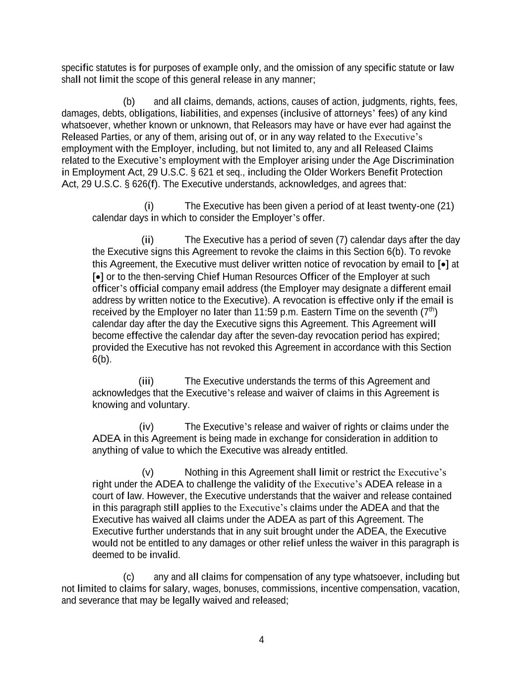 4 specific statutes is for purposes of example only, and the omission of any specific statute or law shall not limit the scope of this general release in any manner; (b) and all claims, demands, actions, causes of action, judgments, rights, fees, damages, debts, obligations, liabilities, and expenses (inclusive of attorneys’ fees) of any kind whatsoever, whether known or unknown, that Releasors may have or have ever had against the Released Parties, or any of them, arising out of, or in any way related to the Executive’s employment with the Employer, including, but not limited to, any and all Released Claims related to the Executive’s employment with the Employer arising under the Age Discrimination in Employment Act, 29 U.S.C. § 621 et seq., including the Older Workers Benefit Protection Act, 29 U.S.C. § 626(f). The Executive understands, acknowledges, and agrees that: (i) The Executive has been given a period of at least twenty-one (21) calendar days in which to consider the Employer’s offer. (ii) The Executive has a period of seven (7) calendar days after the day the Executive signs this Agreement to revoke the claims in this Section 6(b). To revoke this Agreement, the Executive must deliver written notice of revocation by email to [•] at [•] or to the then-serving Chief Human Resources Officer of the Employer at such officer’s official company email address (the Employer may designate a different email address by written notice to the Executive). A revocation is effective only if the email is received by the Employer no later than 11:59 p.m. Eastern Time on the seventh (7th) calendar day after the day the Executive signs this Agreement. This Agreement will become effective the calendar day after the seven-day revocation period has expired; provided the Executive has not revoked this Agreement in accordance with this Section 6(b). (iii) The Executive understands the terms of this Agreement and acknowledges that the Executive’s release and waiver of claims in this Agreement is knowing and voluntary. (iv) The Executive’s release and waiver of rights or claims under the ADEA in this Agreement is being made in exchange for consideration in addition to anything of value to which the Executive was already entitled. (v) Nothing in this Agreement shall limit or restrict the Executive’s right under the ADEA to challenge the validity of the Executive’s ADEA release in a court of law. However, the Executive understands that the waiver and release contained in this paragraph still applies to the Executive’s claims under the ADEA and that the Executive has waived all claims under the ADEA as part of this Agreement. The Executive further understands that in any suit brought under the ADEA, the Executive would not be entitled to any damages or other relief unless the waiver in this paragraph is deemed to be invalid. (c) any and all claims for compensation of any type whatsoever, including but not limited to claims for salary, wages, bonuses, commissions, incentive compensation, vacation, and severance that may be legally waived and released;