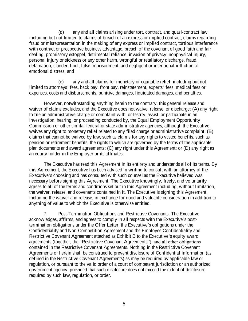 5 (d) any and all claims arising under tort, contract, and quasi-contract law, including but not limited to claims of breach of an express or implied contract, claims regarding fraud or misrepresentation in the making of any express or implied contract, tortious interference with contract or prospective business advantage, breach of the covenant of good faith and fair dealing, promissory estoppel, detrimental reliance, invasion of privacy, nonphysical injury, personal injury or sickness or any other harm, wrongful or retaliatory discharge, fraud, defamation, slander, libel, false imprisonment, and negligent or intentional infliction of emotional distress; and (e) any and all claims for monetary or equitable relief, including but not limited to attorneys’ fees, back pay, front pay, reinstatement, experts’ fees, medical fees or expenses, costs and disbursements, punitive damages, liquidated damages, and penalties. However, notwithstanding anything herein to the contrary, this general release and waiver of claims excludes, and the Executive does not waive, release, or discharge: (A) any right to file an administrative charge or complaint with, or testify, assist, or participate in an investigation, hearing, or proceeding conducted by, the Equal Employment Opportunity Commission or other similar federal or state administrative agencies, although the Executive waives any right to monetary relief related to any filed charge or administrative complaint; (B) claims that cannot be waived by law, such as claims for any rights to vested benefits, such as pension or retirement benefits, the rights to which are governed by the terms of the applicable plan documents and award agreements; (C) any right under this Agreement; or (D) any right as an equity holder in the Employer or its affiliates. The Executive has read this Agreement in its entirety and understands all of its terms. By this Agreement, the Executive has been advised in writing to consult with an attorney of the Executive’s choosing and has consulted with such counsel as the Executive believed was necessary before signing this Agreement. The Executive knowingly, freely, and voluntarily agrees to all of the terms and conditions set out in this Agreement including, without limitation, the waiver, release, and covenants contained in it. The Executive is signing this Agreement, including the waiver and release, in exchange for good and valuable consideration in addition to anything of value to which the Executive is otherwise entitled. 7. Post-Termination Obligations and Restrictive Covenants. The Executive acknowledges, affirms, and agrees to comply in all respects with the Executive’s post- termination obligations under the Offer Letter, the Executive’s obligations under the Confidentiality and Non-Competition Agreement and the Employee Confidentiality and Restrictive Covenant Agreement attached as Exhibit B to the Executive’s equity award agreements (together, the “Restrictive Covenant Agreements”), and all other obligations contained in the Restrictive Covenant Agreements. Nothing in the Restrictive Covenant Agreements or herein shall be construed to prevent disclosure of Confidential Information (as defined in the Restrictive Covenant Agreements) as may be required by applicable law or regulation, or pursuant to the valid order of a court of competent jurisdiction or an authorized government agency, provided that such disclosure does not exceed the extent of disclosure required by such law, regulation, or order.