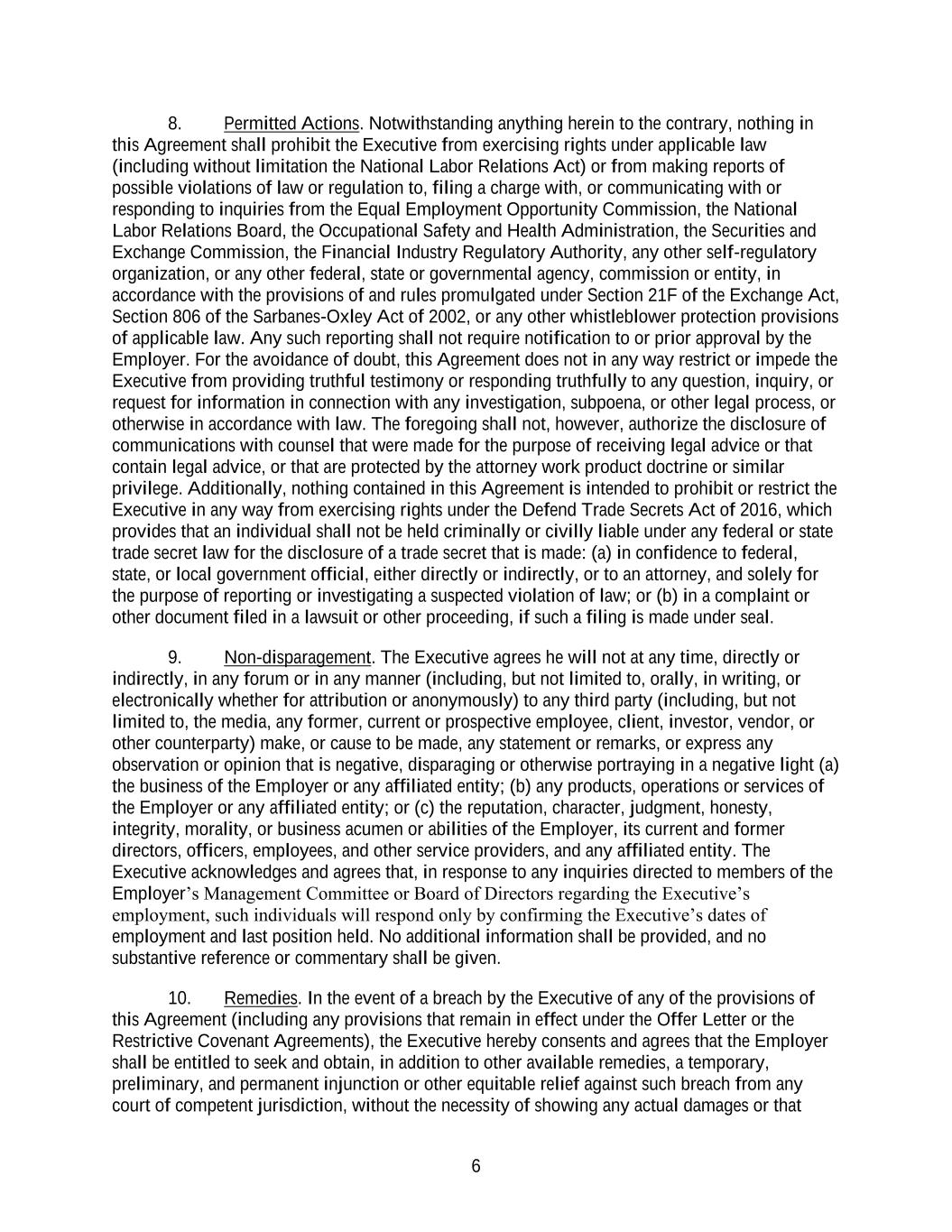 6 8. Permitted Actions. Notwithstanding anything herein to the contrary, nothing in this Agreement shall prohibit the Executive from exercising rights under applicable law (including without limitation the National Labor Relations Act) or from making reports of possible violations of law or regulation to, filing a charge with, or communicating with or responding to inquiries from the Equal Employment Opportunity Commission, the National Labor Relations Board, the Occupational Safety and Health Administration, the Securities and Exchange Commission, the Financial Industry Regulatory Authority, any other self-regulatory organization, or any other federal, state or governmental agency, commission or entity, in accordance with the provisions of and rules promulgated under Section 21F of the Exchange Act, Section 806 of the Sarbanes-Oxley Act of 2002, or any other whistleblower protection provisions of applicable law. Any such reporting shall not require notification to or prior approval by the Employer. For the avoidance of doubt, this Agreement does not in any way restrict or impede the Executive from providing truthful testimony or responding truthfully to any question, inquiry, or request for information in connection with any investigation, subpoena, or other legal process, or otherwise in accordance with law. The foregoing shall not, however, authorize the disclosure of communications with counsel that were made for the purpose of receiving legal advice or that contain legal advice, or that are protected by the attorney work product doctrine or similar privilege. Additionally, nothing contained in this Agreement is intended to prohibit or restrict the Executive in any way from exercising rights under the Defend Trade Secrets Act of 2016, which provides that an individual shall not be held criminally or civilly liable under any federal or state trade secret law for the disclosure of a trade secret that is made: (a) in confidence to federal, state, or local government official, either directly or indirectly, or to an attorney, and solely for the purpose of reporting or investigating a suspected violation of law; or (b) in a complaint or other document filed in a lawsuit or other proceeding, if such a filing is made under seal. 9. Non-disparagement. The Executive agrees he will not at any time, directly or indirectly, in any forum or in any manner (including, but not limited to, orally, in writing, or electronically whether for attribution or anonymously) to any third party (including, but not limited to, the media, any former, current or prospective employee, client, investor, vendor, or other counterparty) make, or cause to be made, any statement or remarks, or express any observation or opinion that is negative, disparaging or otherwise portraying in a negative light (a) the business of the Employer or any affiliated entity; (b) any products, operations or services of the Employer or any affiliated entity; or (c) the reputation, character, judgment, honesty, integrity, morality, or business acumen or abilities of the Employer, its current and former directors, officers, employees, and other service providers, and any affiliated entity. The Executive acknowledges and agrees that, in response to any inquiries directed to members of the Employer’s Management Committee or Board of Directors regarding the Executive’s employment, such individuals will respond only by confirming the Executive’s dates of employment and last position held. No additional information shall be provided, and no substantive reference or commentary shall be given. 10. Remedies. In the event of a breach by the Executive of any of the provisions of this Agreement (including any provisions that remain in effect under the Offer Letter or the Restrictive Covenant Agreements), the Executive hereby consents and agrees that the Employer shall be entitled to seek and obtain, in addition to other available remedies, a temporary, preliminary, and permanent injunction or other equitable relief against such breach from any court of competent jurisdiction, without the necessity of showing any actual damages or that