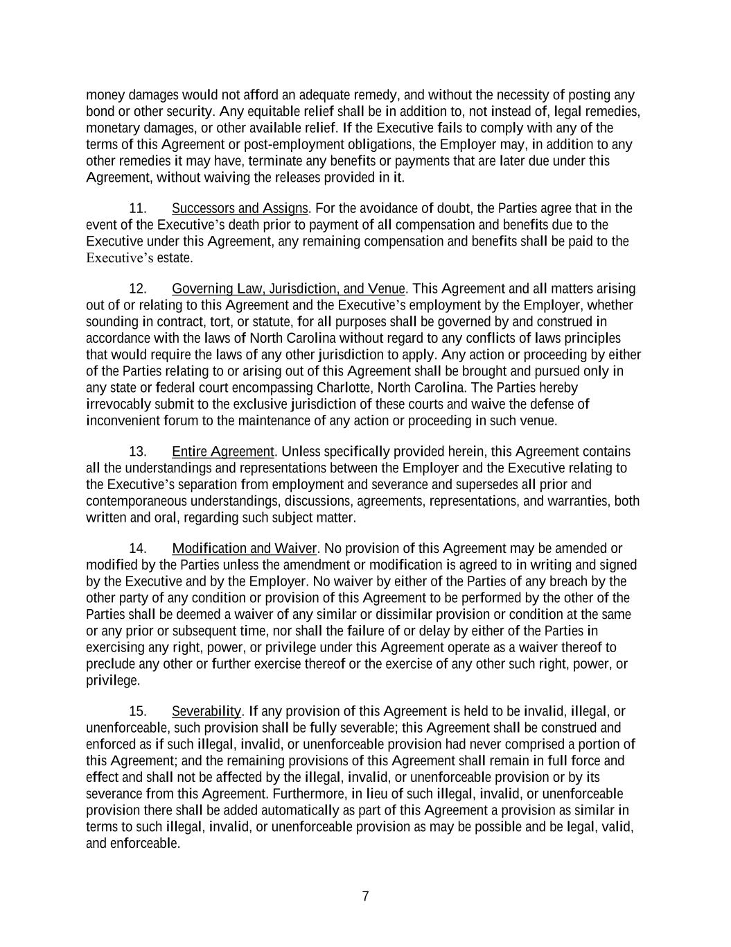 7 money damages would not afford an adequate remedy, and without the necessity of posting any bond or other security. Any equitable relief shall be in addition to, not instead of, legal remedies, monetary damages, or other available relief. If the Executive fails to comply with any of the terms of this Agreement or post-employment obligations, the Employer may, in addition to any other remedies it may have, terminate any benefits or payments that are later due under this Agreement, without waiving the releases provided in it. 11. Successors and Assigns. For the avoidance of doubt, the Parties agree that in the event of the Executive’s death prior to payment of all compensation and benefits due to the Executive under this Agreement, any remaining compensation and benefits shall be paid to the Executive’s estate. 12. Governing Law, Jurisdiction, and Venue. This Agreement and all matters arising out of or relating to this Agreement and the Executive’s employment by the Employer, whether sounding in contract, tort, or statute, for all purposes shall be governed by and construed in accordance with the laws of North Carolina without regard to any conflicts of laws principles that would require the laws of any other jurisdiction to apply. Any action or proceeding by either of the Parties relating to or arising out of this Agreement shall be brought and pursued only in any state or federal court encompassing Charlotte, North Carolina. The Parties hereby irrevocably submit to the exclusive jurisdiction of these courts and waive the defense of inconvenient forum to the maintenance of any action or proceeding in such venue. 13. Entire Agreement. Unless specifically provided herein, this Agreement contains all the understandings and representations between the Employer and the Executive relating to the Executive’s separation from employment and severance and supersedes all prior and contemporaneous understandings, discussions, agreements, representations, and warranties, both written and oral, regarding such subject matter. 14. Modification and Waiver. No provision of this Agreement may be amended or modified by the Parties unless the amendment or modification is agreed to in writing and signed by the Executive and by the Employer. No waiver by either of the Parties of any breach by the other party of any condition or provision of this Agreement to be performed by the other of the Parties shall be deemed a waiver of any similar or dissimilar provision or condition at the same or any prior or subsequent time, nor shall the failure of or delay by either of the Parties in exercising any right, power, or privilege under this Agreement operate as a waiver thereof to preclude any other or further exercise thereof or the exercise of any other such right, power, or privilege. 15. Severability. If any provision of this Agreement is held to be invalid, illegal, or unenforceable, such provision shall be fully severable; this Agreement shall be construed and enforced as if such illegal, invalid, or unenforceable provision had never comprised a portion of this Agreement; and the remaining provisions of this Agreement shall remain in full force and effect and shall not be affected by the illegal, invalid, or unenforceable provision or by its severance from this Agreement. Furthermore, in lieu of such illegal, invalid, or unenforceable provision there shall be added automatically as part of this Agreement a provision as similar in terms to such illegal, invalid, or unenforceable provision as may be possible and be legal, valid, and enforceable.