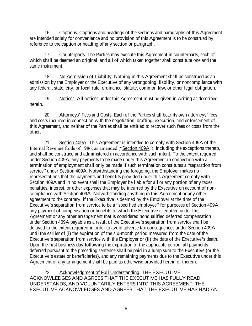 8 16. Captions. Captions and headings of the sections and paragraphs of this Agreement are intended solely for convenience and no provision of this Agreement is to be construed by reference to the caption or heading of any section or paragraph. 17. Counterparts. The Parties may execute this Agreement in counterparts, each of which shall be deemed an original, and all of which taken together shall constitute one and the same instrument. 18. No Admission of Liability. Nothing in this Agreement shall be construed as an admission by the Employer or the Executive of any wrongdoing, liability, or noncompliance with any federal, state, city, or local rule, ordinance, statute, common law, or other legal obligation. 19. Notices. All notices under this Agreement must be given in writing as described herein. 20. Attorneys’ Fees and Costs. Each of the Parties shall bear its own attorneys’ fees and costs incurred in connection with the negotiation, drafting, execution, and enforcement of this Agreement, and neither of the Parties shall be entitled to recover such fees or costs from the other. 21. Section 409A. This Agreement is intended to comply with Section 409A of the Internal Revenue Code of 1986, as amended (“Section 409A”), including the exceptions thereto, and shall be construed and administered in accordance with such intent. To the extent required under Section 409A, any payments to be made under this Agreement in connection with a termination of employment shall only be made if such termination constitutes a “separation from service” under Section 409A. Notwithstanding the foregoing, the Employer makes no representations that the payments and benefits provided under this Agreement comply with Section 409A and in no event shall the Employer be liable for all or any portion of any taxes, penalties, interest, or other expenses that may be incurred by the Executive on account of non- compliance with Section 409A. Notwithstanding anything in this Agreement or any other agreement to the contrary, if the Executive is deemed by the Employer at the time of the Executive’s separation from service to be a “specified employee” for purposes of Section 409A, any payment of compensation or benefits to which the Executive is entitled under this Agreement or any other arrangement that is considered nonqualified deferred compensation under Section 409A payable as a result of the Executive’s separation from service shall be delayed to the extent required in order to avoid adverse tax consequences under Section 409A until the earlier of (i) the expiration of the six-month period measured from the date of the Executive’s separation from service with the Employer or (ii) the date of the Executive’s death. Upon the first business day following the expiration of the applicable period, all payments deferred pursuant to the preceding sentence shall be paid in a lump sum to the Executive (or the Executive’s estate or beneficiaries), and any remaining payments due to the Executive under this Agreement or any arrangement shall be paid as otherwise provided herein or therein. 22. Acknowledgment of Full Understanding. THE EXECUTIVE ACKNOWLEDGES AND AGREES THAT THE EXECUTIVE HAS FULLY READ, UNDERSTANDS, AND VOLUNTARILY ENTERS INTO THIS AGREEMENT. THE EXECUTIVE ACKNOWLEDGES AND AGREES THAT THE EXECUTIVE HAS HAD AN