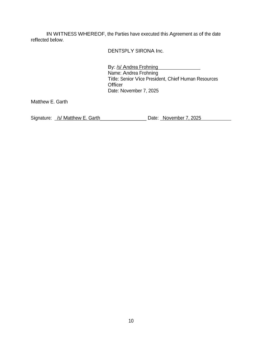 10 IN WITNESS WHEREOF, the Parties have executed this Agreement as of the date reflected below. DENTSPLY SIRONA Inc. By: /s/ Andrea Frohning Name: Andrea Frohning Title: Senior Vice President, Chief Human Resources Officer Date: November 7, 2025 Matthew E. Garth Signature: /s/ Matthew E. Garth__________________ Date: November 7, 2025