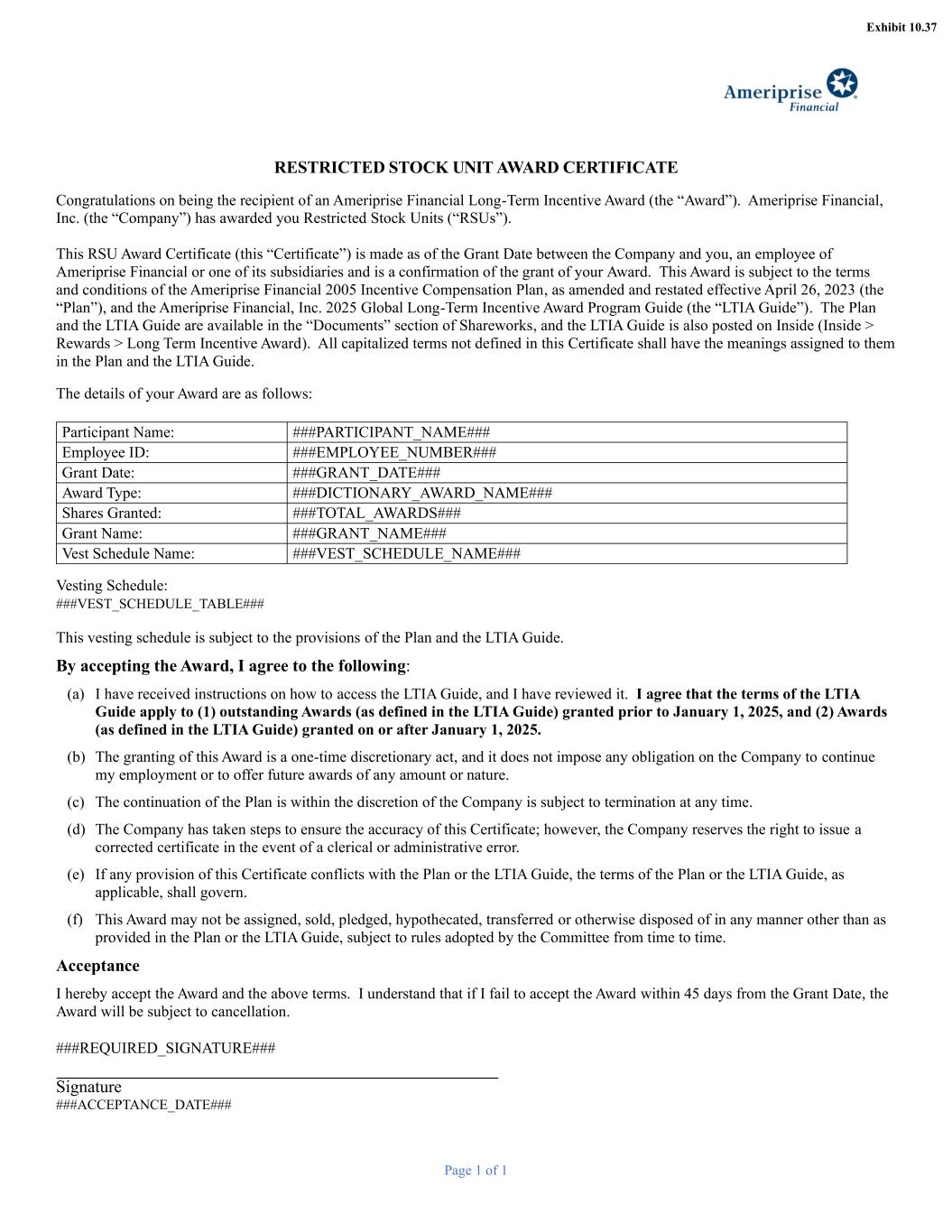 Page 1 of 1 RESTRICTED STOCK UNIT AWARD CERTIFICATE Congratulations on being the recipient of an Ameriprise Financial Long-Term Incentive Award (the “Award”). Ameriprise Financial, Inc. (the “Company”) has awarded you Restricted Stock Units (“RSUs”). This RSU Award Certificate (this “Certificate”) is made as of the Grant Date between the Company and you, an employee of Ameriprise Financial or one of its subsidiaries and is a confirmation of the grant of your Award. This Award is subject to the terms and conditions of the Ameriprise Financial 2005 Incentive Compensation Plan, as amended and restated effective April 26, 2023 (the “Plan”), and the Ameriprise Financial, Inc. 2025 Global Long-Term Incentive Award Program Guide (the “LTIA Guide”). The Plan and the LTIA Guide are available in the “Documents” section of Shareworks, and the LTIA Guide is also posted on Inside (Inside > Rewards > Long Term Incentive Award). All capitalized terms not defined in this Certificate shall have the meanings assigned to them in the Plan and the LTIA Guide. The details of your Award are as follows: Vesting Schedule: ###VEST_SCHEDULE_TABLE### This vesting schedule is subject to the provisions of the Plan and the LTIA Guide. By accepting the Award, I agree to the following: (a) I have received instructions on how to access the LTIA Guide, and I have reviewed it. I agree that the terms of the LTIA Guide apply to (1) outstanding Awards (as defined in the LTIA Guide) granted prior to January 1, 2025, and (2) Awards (as defined in the LTIA Guide) granted on or after January 1, 2025. (b) The granting of this Award is a one-time discretionary act, and it does not impose any obligation on the Company to continue my employment or to offer future awards of any amount or nature. (c) The continuation of the Plan is within the discretion of the Company is subject to termination at any time. (d) The Company has taken steps to ensure the accuracy of this Certificate; however, the Company reserves the right to issue a corrected certificate in the event of a clerical or administrative error. (e) If any provision of this Certificate conflicts with the Plan or the LTIA Guide, the terms of the Plan or the LTIA Guide, as applicable, shall govern. (f) This Award may not be assigned, sold, pledged, hypothecated, transferred or otherwise disposed of in any manner other than as provided in the Plan or the LTIA Guide, subject to rules adopted by the Committee from time to time. Acceptance I hereby accept the Award and the above terms. I understand that if I fail to accept the Award within 45 days from the Grant Date, the Award will be subject to cancellation. ###REQUIRED_SIGNATURE### Signature ###ACCEPTANCE_DATE### Participant Name: ###PARTICIPANT_NAME### Employee ID: ###EMPLOYEE_NUMBER### Grant Date: ###GRANT_DATE### Award Type: ###DICTIONARY_AWARD_NAME### Shares Granted: ###TOTAL_AWARDS### Grant Name: ###GRANT_NAME### Vest Schedule Name: ###VEST_SCHEDULE_NAME### Exhibit 10.37