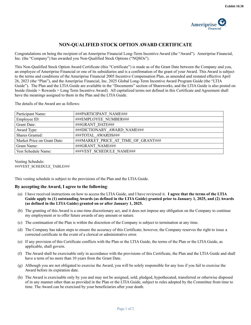 Page 1 of 2 NON-QUALIFIED STOCK OPTION AWARD CERTIFICATE Congratulations on being the recipient of an Ameriprise Financial Long-Term Incentive Award (the “Award”). Ameriprise Financial, Inc. (the “Company”) has awarded you Non-Qualified Stock Options (“NQSOs”). This Non-Qualified Stock Option Award Certificate (this “Certificate”) is made as of the Grant Date between the Company and you, an employee of Ameriprise Financial or one of its subsidiaries and is a confirmation of the grant of your Award. This Award is subject to the terms and conditions of the Ameriprise Financial 2005 Incentive Compensation Plan, as amended and restated effective April 26, 2023 (the “Plan”), and the Ameriprise Financial, Inc. 2025 Global Long-Term Incentive Award Program Guide (the “LTIA Guide”). The Plan and the LTIA Guide are available in the “Documents” section of Shareworks, and the LTIA Guide is also posted on Inside (Inside > Rewards > Long Term Incentive Award). All capitalized terms not defined in this Certificate and Agreement shall have the meanings assigned to them in the Plan and the LTIA Guide. The details of the Award are as follows: Vesting Schedule: ###VEST_SCHEDULE_TABLE### This vesting schedule is subject to the provisions of the Plan and the LTIA Guide. By accepting the Award, I agree to the following: (a) I have received instructions on how to access the LTIA Guide, and I have reviewed it. I agree that the terms of the LTIA Guide apply to (1) outstanding Awards (as defined in the LTIA Guide) granted prior to January 1, 2025, and (2) Awards (as defined in the LTIA Guide) granted on or after January 1, 2025. (b) The granting of this Award is a one-time discretionary act, and it does not impose any obligation on the Company to continue my employment or to offer future awards of any amount or nature. (c) The continuation of the Plan is within the discretion of the Company is subject to termination at any time. (d) The Company has taken steps to ensure the accuracy of this Certificate; however, the Company reserves the right to issue a corrected certificate in the event of a clerical or administrative error. (e) If any provision of this Certificate conflicts with the Plan or the LTIA Guide, the terms of the Plan or the LTIA Guide, as applicable, shall govern. (f) The Award shall be exercisable only in accordance with the provisions of this Certificate, the Plan and the LTIA Guide and shall have a term of no more than 10 years from the Grant Date. (g) Although you are not obligated to exercise the Award, you will be solely responsible for any loss if you fail to exercise the Award before its expiration date. (h) The Award is exercisable only by you and may not be assigned, sold, pledged, hypothecated, transferred or otherwise disposed of in any manner other than as provided in the Plan or the LTIA Guide, subject to rules adopted by the Committee from time to time. The Award can be exercised by your beneficiaries after your death. Participant Name: ###PARTICIPANT_NAME### Employee ID: ###EMPLOYEE_NUMBER### Grant Date: ###GRANT_DATE### Award Type: ###DICTIONARY_AWARD_NAME### Shares Granted: ###TOTAL_AWARDS### Market Price on Grant Date: ###MARKET_PRICE_AT_TIME_OF_GRANT### Grant Name: ###GRANT_NAME### Vest Schedule Name: ###VEST_SCHEDULE_NAME### Exhibit 10.38