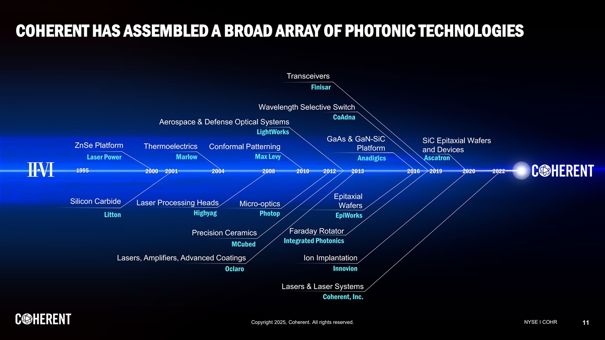 FOCUSED ON TWO CORE GROWTH MARKETS Datacenter and Communications Industrial Precision Mfg $6B Datacenter Communications Instrumentation $32B $12B and Other $8B $23B $44B 2030 SAM 2030 SAM Auto & Energy Semi Cap & Display $5B $4B Fast Growth High Margin Diversified and Complementary End Market Exposure Copyright 2025, Coherent. All rights reserved. NYSE I COHR 10