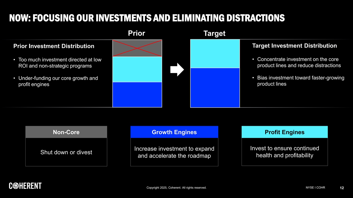 NOW: FOCUSING OUR INVESTMENTS AND ELIMINATING DISTRACTIONS Prior Target Target Investment Distribution Prior Investment Distribution • Concentrate investment on the core • Too much investment directed at low product lines and reduce distractions ROI and non-strategic programs • Bias investment toward faster-growing • Under-funding our core growth and product lines profit engines Non-Core Growth Engines Profit Engines Invest to ensure continued Increase investment to expand Shut down or divest health and profitability and accelerate the roadmap Copyright 2025, Coherent. All rights reserved. NYSE I COHR 12